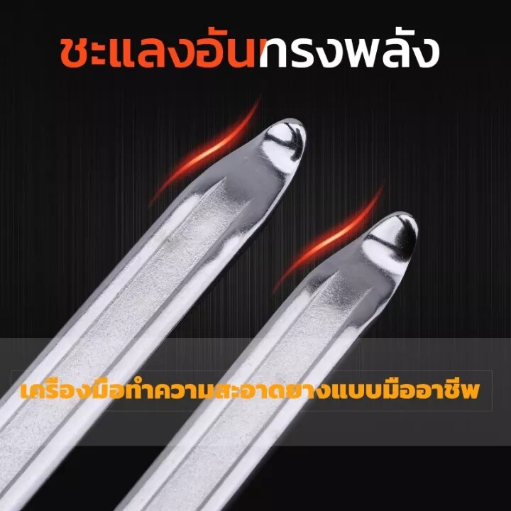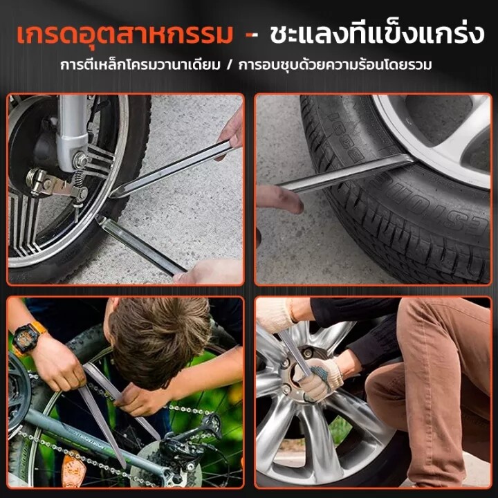 สำหรับการงัดยางออกจากล้อ ทำได้โดยการเสียบปลายเหล็กงัดยางเข้าไประหว่างยางกับล้อแล้วงัดเอายางออกมานอกโครงล้อ โดยปกติจะต้องใช้เหล็กงัดยาง 2 อัน โดย เมื่อเหล็กงัดยางอันแรกงัดยางออกมาจากโครงล้อแล้วให้ปล่อยเหล็กงัดยางค้างไว้ จากนั้นจึงใช้เหล็กงัดยางอันที่ 2 งัดยางห่างจากตำแหน่งแรกประมาณ 3 นิ้ว เมื่องัดจุดที่ 2 ได้แล้วก็ค่อยๆขยับแล้วงัดยางออกมาเรื่อยๆจนครบวง✨วิธีการใช้งาน✨เหล็กงัดยางสามารถใช้เพื่องัดยางออกจากล้อหรืองัดยางเข้าไปในล้อ สำหรับการงัดยางเข้าไปในล้อ การงัดยางเข้าไปในล้อใช้เหล็กงัดยางเพียงอันเดียว โดยการสอดเหล็กงัดยางเข้าไปในโครงล้อก่อนแล้วจึงงัดเอายางเข้าไปด้านในโครงล้อ ค่อยๆขยับเลื่อนแนวยางไปทีละนิ๊ดจนครบวงล้อ#เหล็กงัดยาง 12,16,20,24 นิ้ว #ไหมปะยางรถยนต์ #เหล็กงัดยางอย่างดี #เหล็กงัดยางมอเตอร์ไซค์ #เหล็กงัดยางรถยนต์ #เหล็กงัดยางแท้#เหล็กคุณภาพดี #แข็ง #ปะยางรถมอไซค์#ป้องกันสนิม #อุปกรณ์ปะยางรถ#เครื่องถอดยาง