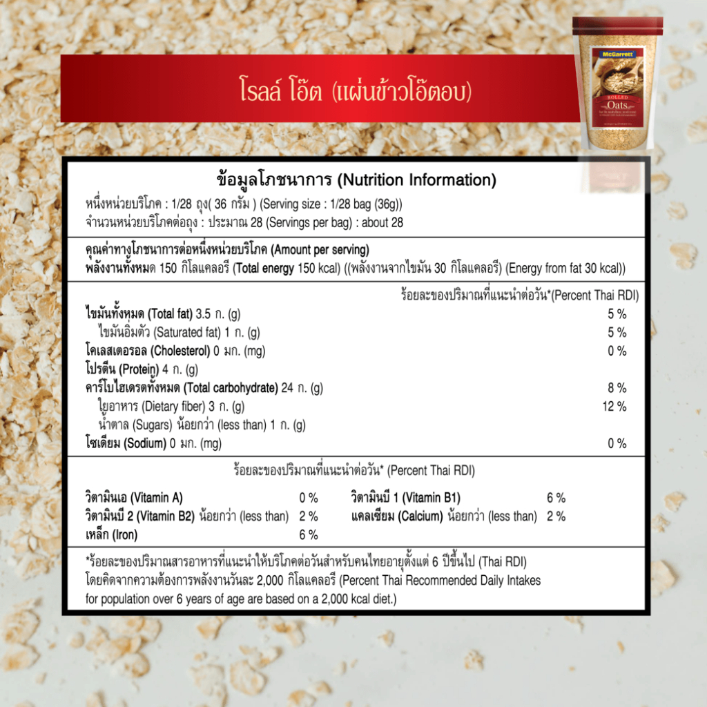 รายละเอียดสินค้า ถุงสีแดง (Rolled Oats) ข้าวโอ๊ตที่ถูกรีดแบนเป็นแผ่น มีความหยาบสุด เหมาะ สำหรับทำขนมเบเกอรี่ เพราะให้เนื้อสัมผัสข้าวโอ๊ตที่ชัดเจน