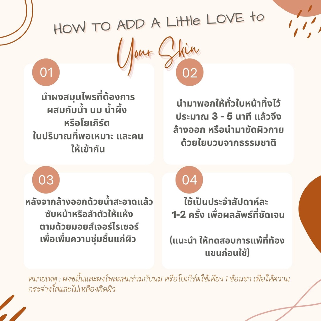 1. สำหรับพอกหน้าและขัดผิว โดยลูกค้าสามารถผสมผงสมุนไพรตามปัญหาผิวของแต่ละคนได้เลยค่า