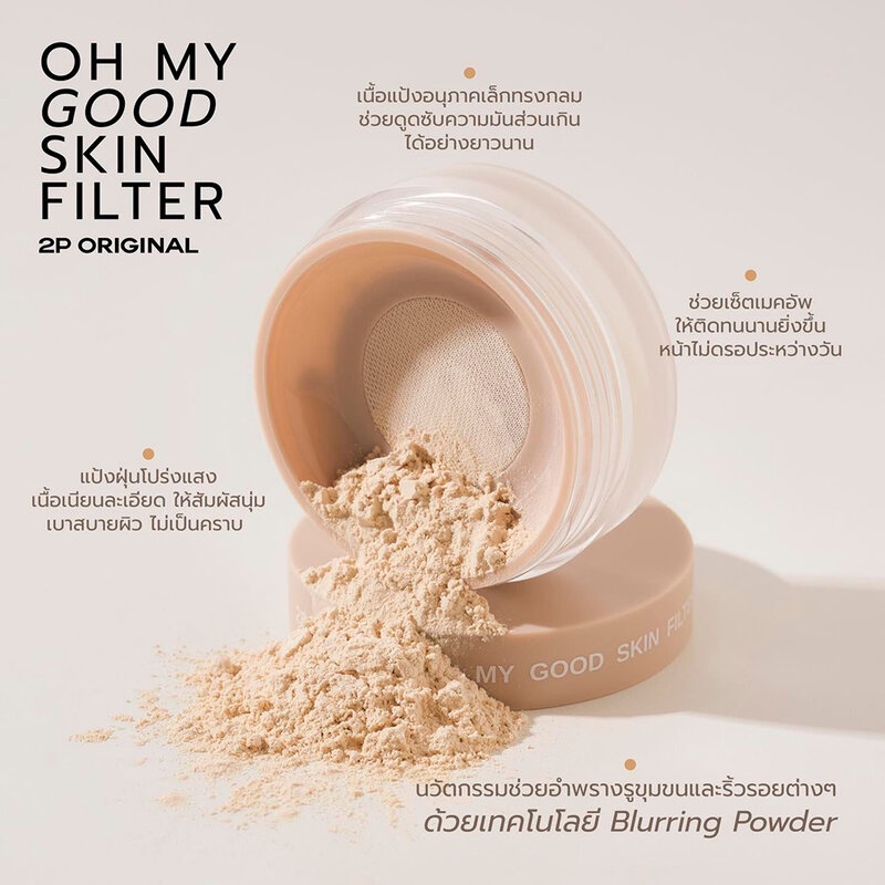 Cr: Facebook.com/2p.original.official2P Original Oh My Good Skin Filter Translucent Powder 10g แป้งฝุ่นโปร่งแสงเนื้อเนียนละเอียด ให้สัมผัสนุ่มเบาสบายผิว ช่วยควบคุมความมันและดูดซับความมันส่วนเกินได้อย่างยาวนาน อีกทั้งมีนวัตกรรมช่วยอำพรางรูขุมขนและริ้วรอยต่างๆ ด้วยเทคโนโลยี Blurring Powder ไม่ก่อให้เกิดคราบบนใบหน้าและช่วยเซ็ตเครื่องสำอางค์ให้ติดทนยาวนานยิ่งขึ้น ใช้แล้วผิวผ่องสวยอย่างเป็นธรรมชาติ สามารถใช้ได้ทุกโทนผิว