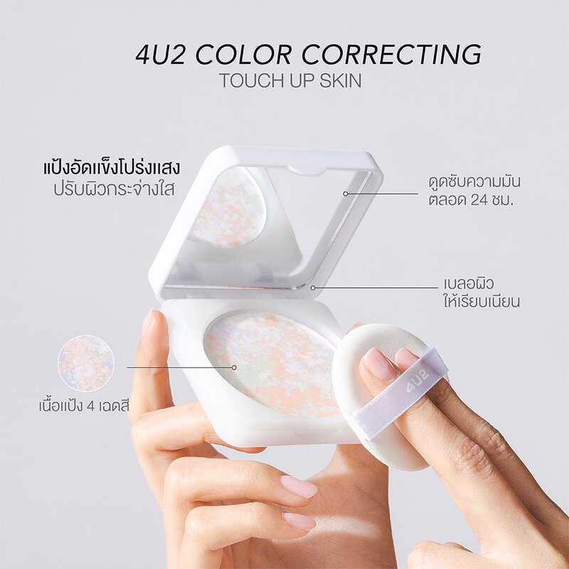 4U2 Skin Color Correcting Touch Up Skin 11g แป้งทาหน้า สร้างผิวสวยกระจ่างใสเป็นธรรมชาติด้วยเนื้อแป้ง 4 เฉดสี มอบผิวหน้าเนียนสวยอย่างเป็นธรรมชาติ อนุภาคแป้ง Smooth Fitting Powder มอบสัมผัสแบบนุ่มนวล ช่วยให้ใบหน้าเรียบเนียนอย่างสม่ำเสมอ มาพร้อมเทคโนโลยี Light Reflecting Pearl อณูมุกที่มอบประกายเปล่งปลั่ง ปรับผิวหน้าให้แลดูสว่างกระจ่างใส ทั้งช่วยควบคุมความมันส่วนเกินบนในหน้าด้วย Oil Lock Powder ผสานคุณค่าสารบำรุงจาก Vitamin E ช่วยบำรุงผิวหน้าให้ใบหน้าเนียนนุ่ม ชุ่มชื่น ไม่แห้งกร้าน•มอบสัมผัสนุ่มนวล ช่วยให้ใบหน้าเรียบเนียน