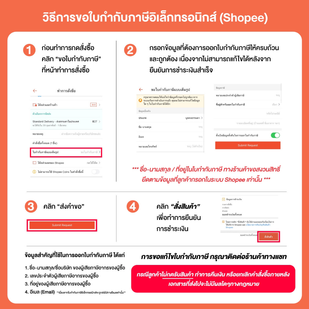 - บริษัทจะ ออกและส่งใบกำกับภาษีทางอีเมล์" ให้กับท่าน หลังจากที่ท่านได้กรอกฟอร์มขอใบกำกับภาษีภายใน 7-14 วันทำการ โดยวันที่ระบุในเอกสารจะเป็นวันที่ออก ไม่ใช่วันที่สั่งซื้อสินค้า