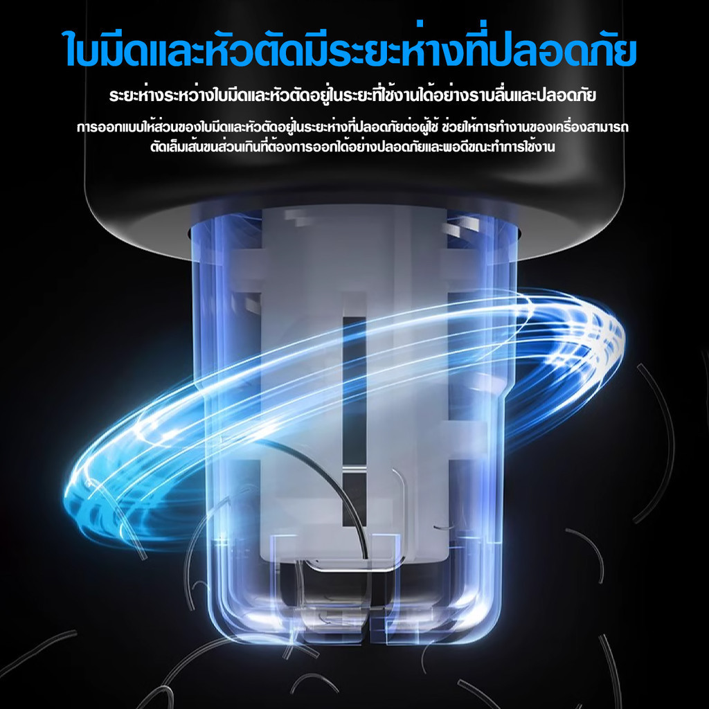 - ใบมีดหมุนซ่อนอยู่ในเกราะป้องกัน และใบมีดไม่สัมผัสผิวหนังโดยตรง การตัดแต่งกิ่งนั้นสะดวกสบายและปลอดภัย