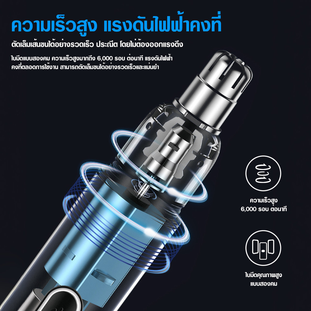 - มอเตอร์ความเร็วสูง 6000r/Min ความเร็วสูง มีเสถียรภาพมากขึ้น มอเตอร์ความเร็วสูงพร้อมใบมีดคม บดเศษขนจมูกทันที หลีกเลี่ยงความลำบากใจของเส้นผม.