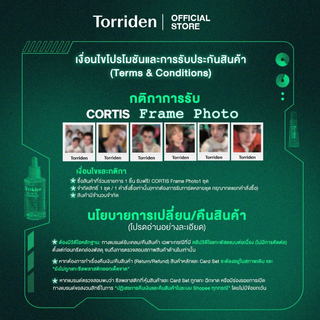 1. ซื้อผลิตภัณฑ์จาก Torriden Official (เฉพาะสินค้าที่ร่วมรายการ) ผ่านช่องทาง Shopee Mall : Torriden Official Store ภายในวันที่ 23 มี.ค. - 23 เม.ย. 2026 เท่านั้น หรือจนกว่าสินค้าจะหมด