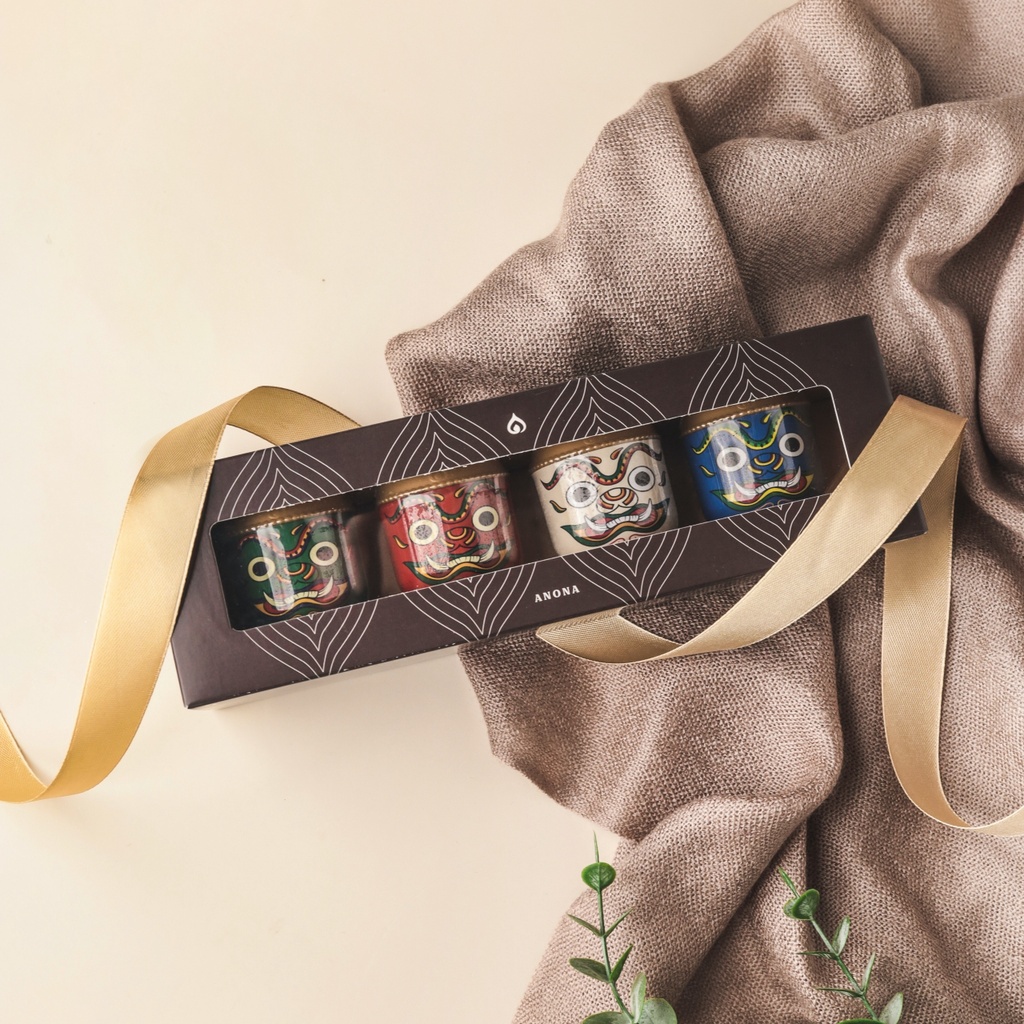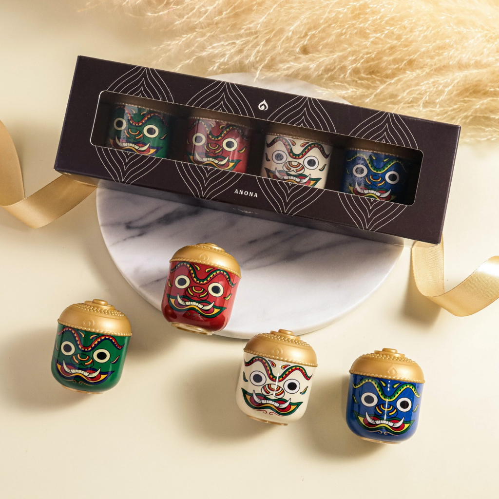 เซตของขวัญรวมสมุนไพรหอมระเหย ANONA 4 กลิ่น ทำจากสมุนไพรกว่า 10 ชนิด หมักด้วยน้ำมันหอมระเหยสกัดจากธรรมชาติ บรรจุในแพคเกจยักษ์ไทยดีไซน์เอกลักษณ์เฉพาะของ ANONA เน้นกลิ่นหอมละมุน ไม่ฉุน ไม่ทำลายเยื่อจมูกบรรจุในแพคเกจสุดเก๋ ดีไซน์เอกลักษณ์ไทย
