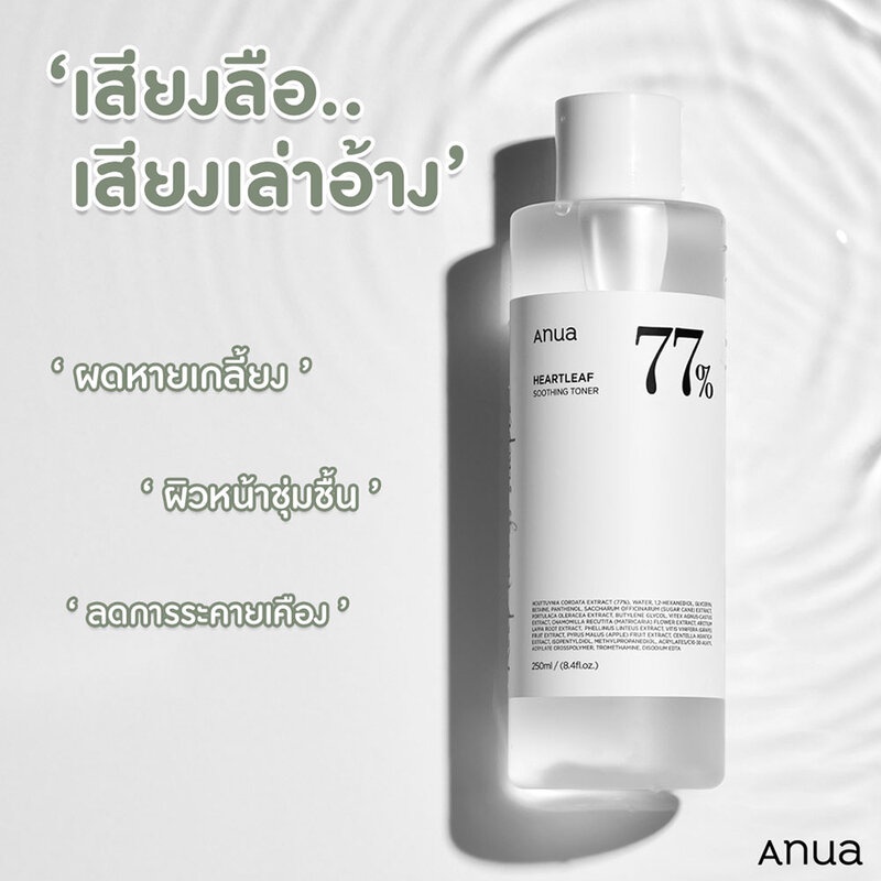 Cr: Facebook.com/anuaofficial.thANUA Heartleaf 77% Soothing Toner 250mlโทนเนอร์บำรุงผิวที่ได้รับความนิยมและมีกระแสโด่งดังในโลกโซเชียล อุดมด้วยสารสกัด Houttuynia Cordata Extract (77%) ช่วยลดการระคายเคือง เสริมสร้างเกราะป้องกันผิว ให้ผิวสู้กับมลภาวะ