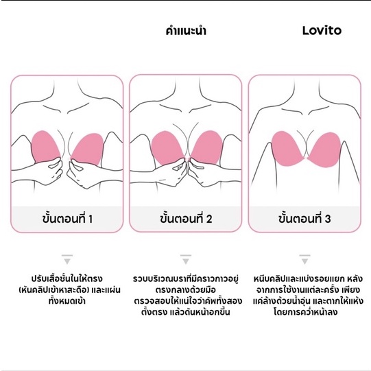 2. วางทีละข้าง ยืนหน้ากระจก ดันส่วนที่ติดกาวออก วางคัพและหน้าอกไว้ที่มุม ตะขอชี้ลง 45 องศาแล้ววางแนบกับผิวหนัง