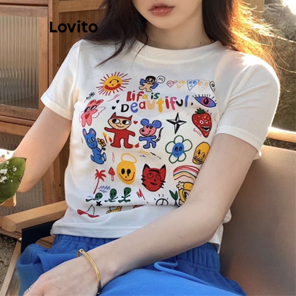 Lovito Áo phông thường ngày Cổ Tròn Tay Ngắn Chữ thả vai cho nữ lna09221 (Màu Đen)