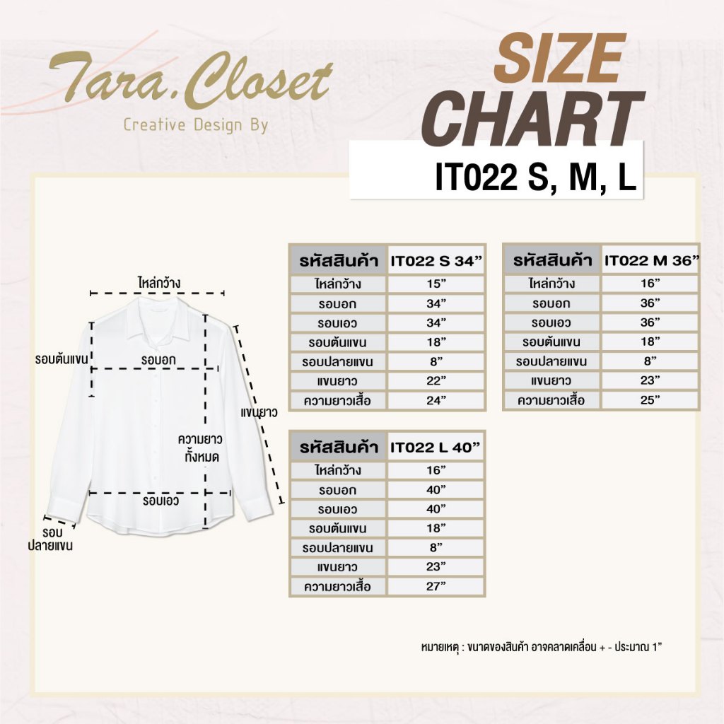 - Sleeve Length ความยาวแขนเสื้อ : 22”