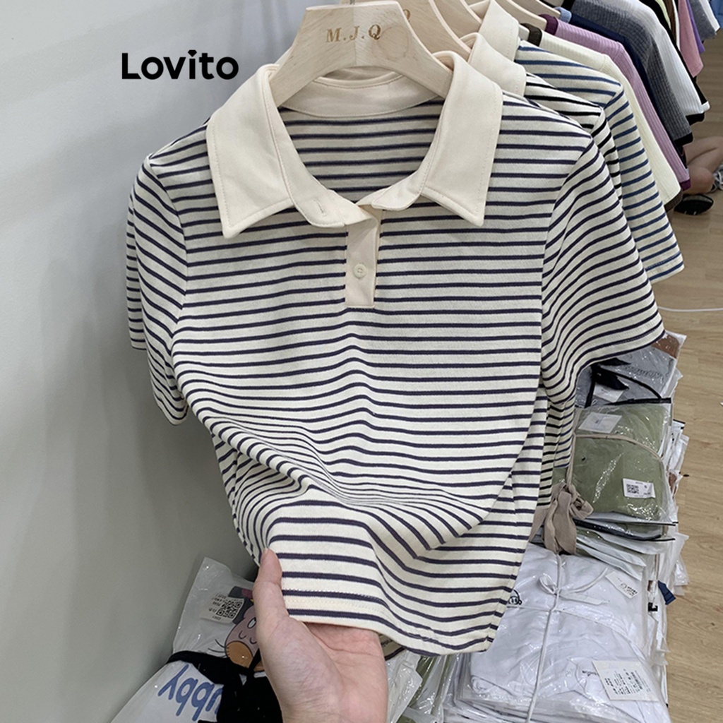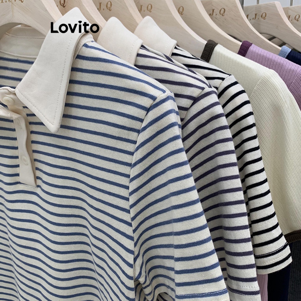 Lovito Áo polo kẻ sọc màu khối thường ngày cho Nữ Áo dệt kim ngắn tay lex01010 (Nhiều màu)