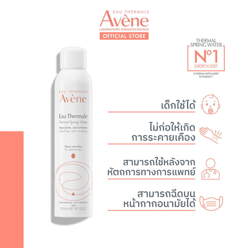Avene Thermal Spring Water 300ml สเปรย์น้ำแร่ สำหรับผิวแพ้ง่าย สเปรย์บางเบา ไม่ก่อให้เกิดการระคายเคือง มอบความชุ่มชื้น ช่วยปลอบประโลมและปรับสมดุลให้แก่ผิว ทำให้ผิวหน้าแข็งแรง สดชื่นตลอดวัน สามารถฉีดบนหน้ากากอนามัยได้• เหมาะกับทุกสภาพผิว