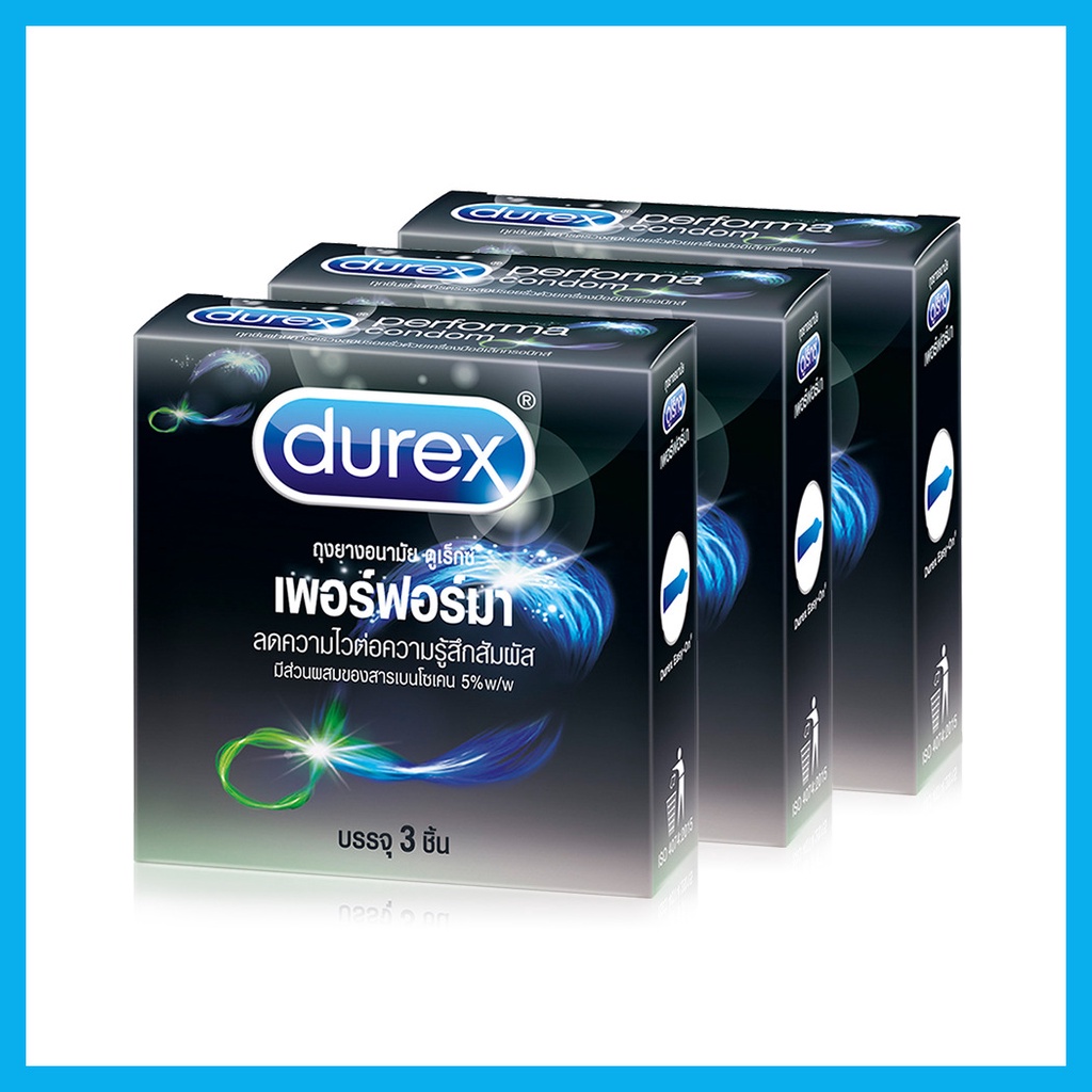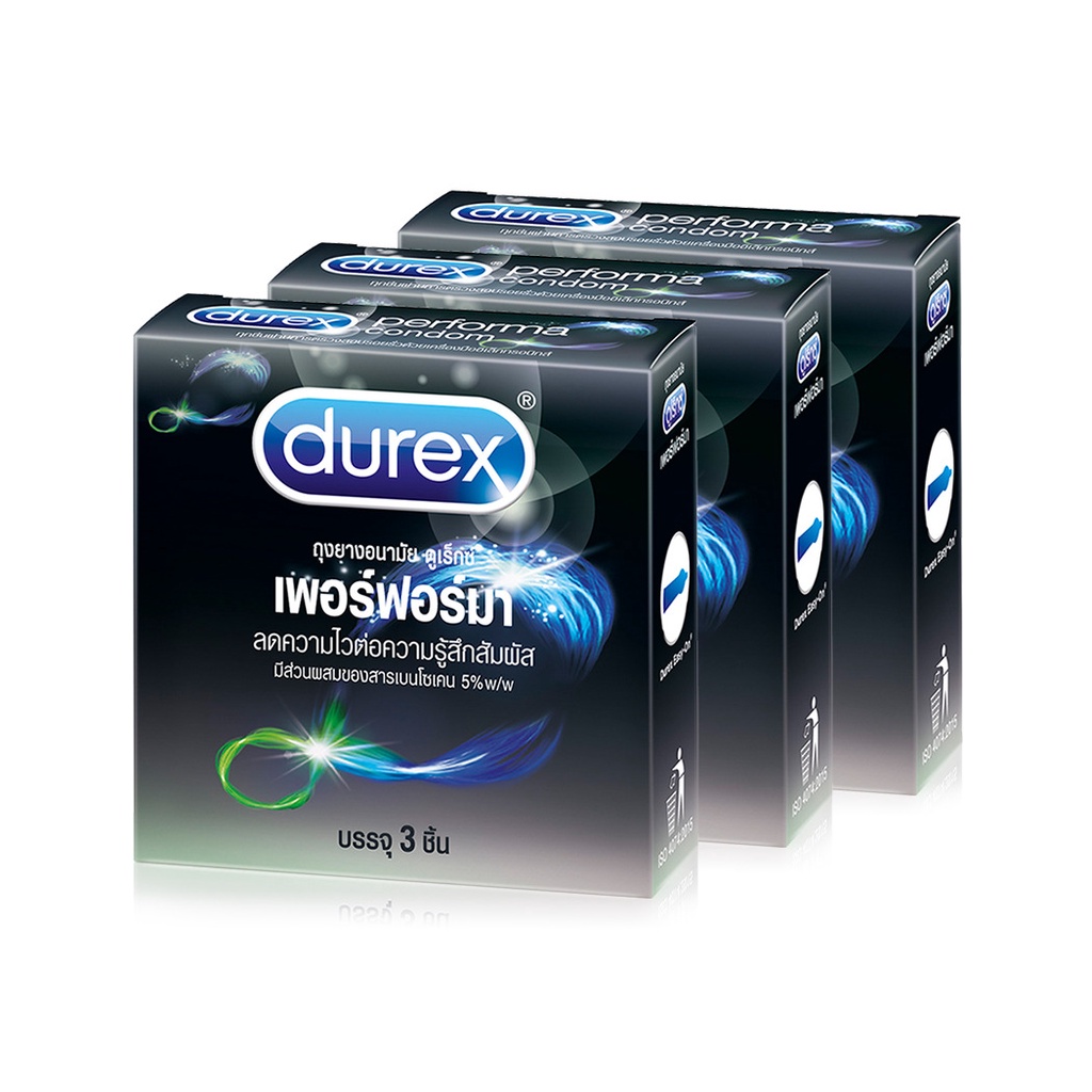 [แพ็คสาม] Durex Performa Condom 52.5mm[3pcs]ถุงยางอนามัยชนิดผิวเรียบขนาด 52.5ม.ม. โปร่งแสงไม่เจือสี ผลิตจากน้ำยางธรรมชาติ ยืดหยุ่น ไม่ขาดง่าย เคลือบสารหล่อลื่นมาตรฐาน Durex พร้อมต่อเวลาให้เกมรักยาวนานถึงใจ ด้วยสารชะลอการหลั่ง เอาใจสายอึดโดยเฉพาะ• ถุงยางขนาด 52.5ม.ม. โปร่งแสงไม่เจือสี