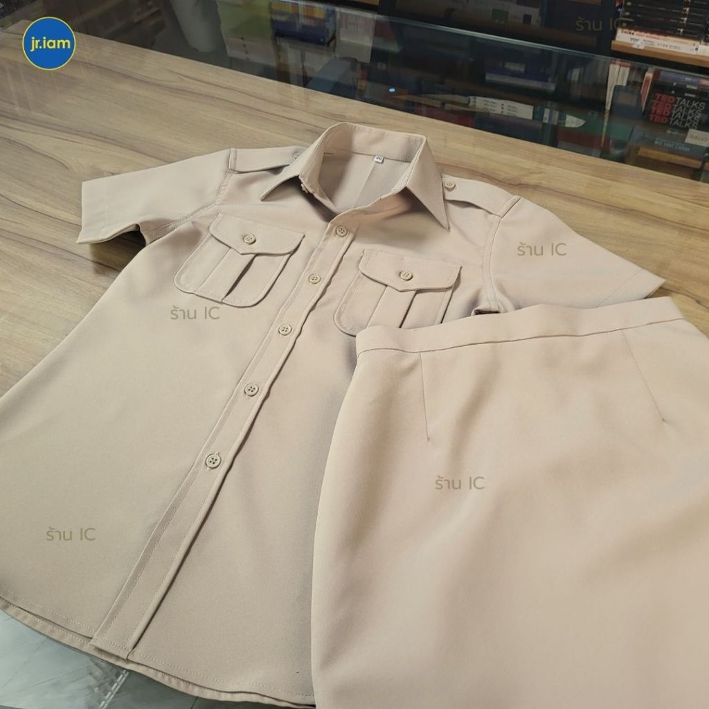 .เสื้อ กระโปรง สีกากี แบบนุ่งทับ