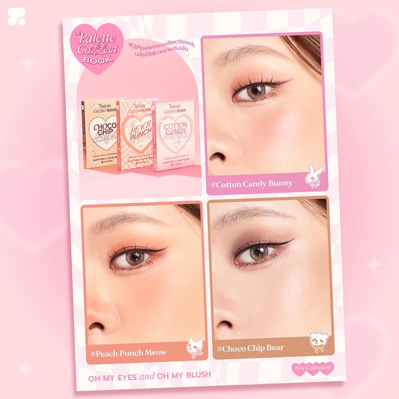 Cr.facebook.com/2p.original.official2P Original Palette Collect Book 14.6g #Cotton Candy Bunny พาเลทอายแชโดว์และบลัชออน ที่สีสันผสมผสานกันอย่างลงตัว ใช้ได้ง่ายในทุกๆ วัน ให้ความรู้สึกนุ่มละมุน เนื้อสัมผัสเนียนนุ่ม แพ็คเกจน่ารักและมีกระจกในตัว ใช้เป็นได้ทั้งบลัชออนและอายแชโดว์ พิกเมนต์สีชัด ติดทนนาน ไม่เป็นฝุ่น และช่วยควบคุมความมัน