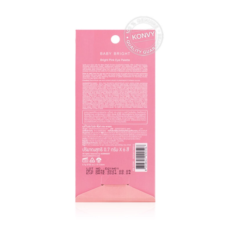Cr: Facebook.com/babybrightclubBaby Bright Bright Pink Eye Palette จุดประกายเสน่ห์ให้ดวงตาคู่สวย ด้วยพาเลทอายแชโดว์ 6 เฉดสีในตลับเดียว เนื้อแมท ชิมเมอร์ประกายมุก และกลิตเตอร์แวววาว ละเอียดเนียนนุ่ม เม็ดสีชัด ติดทน พร้อมบำรุงด้วยผงไข่มุก ช่วยชะลอริ้วรอยเปลือกตาให้เรียบเนียน อ่อนเยาว์เป็นธรรมชาติ สร้างมิติให้ดวงตาดูสวยน่าหลงใหล ได้ทุกลุค ทุกสไตล์