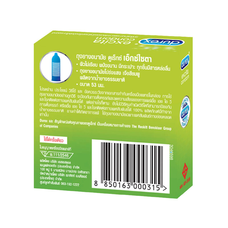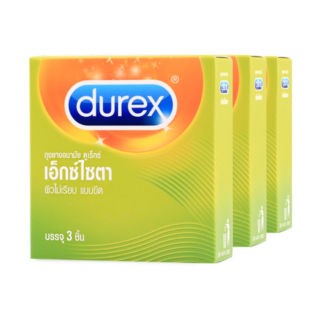 [แพ็คสาม] Durex Excita Condom 53mm[3pcs]ถุงยางอนามัยชนิดผิวไม่เรียบขนาด 53ม.ม. ผนังขนาน เจือสีชมพู ผลิตจากน้ำยางธรรมชาติ ยืดหยุ่น ไม่ขาดง่าย เคลือบสารหล่อลื่นมาตรฐาน Durex พร้อมสารฆ่าเชื้ออสุจิ ช่วยเพิ่มความเร้าใจให้ทุกจังหวะรักด้วยผิวสัมผัสแบบริ้วพิเศษ (Improved Ribbed) ฟินถึงใจ• ถุงยางขนาด 53ม.ม. ผนังขนาน เจือสีชมพู