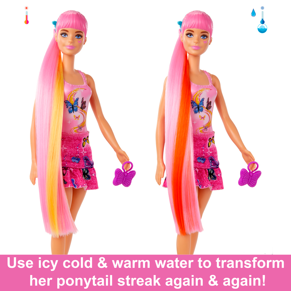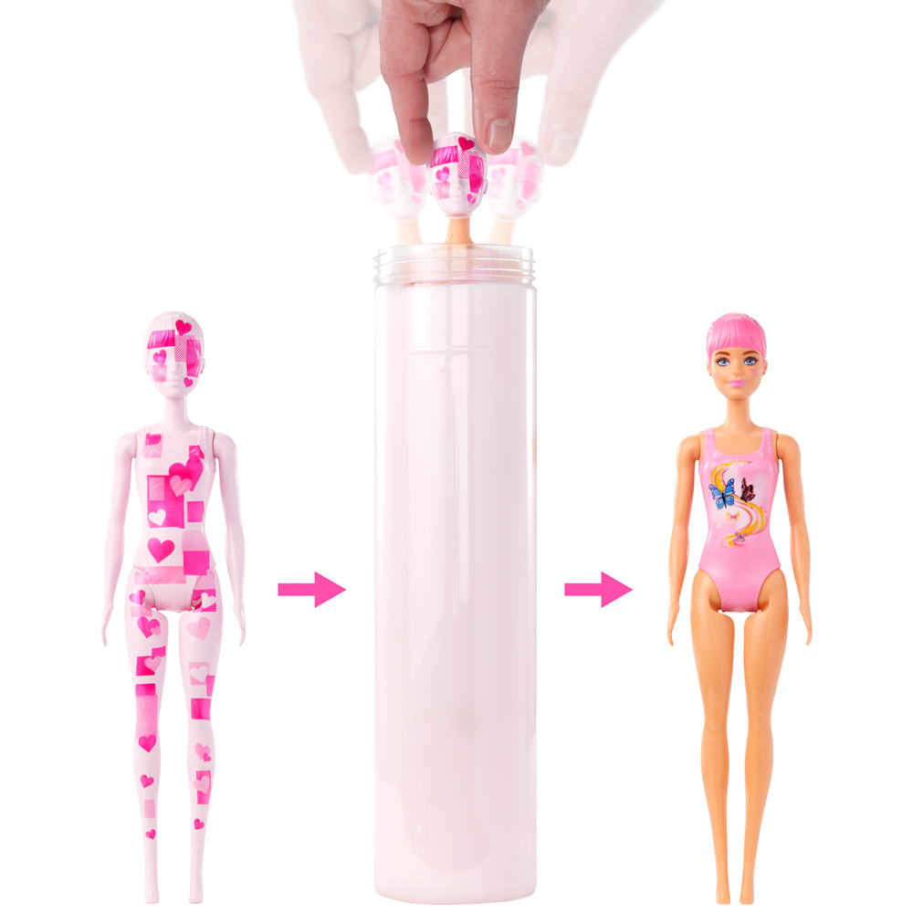 • เริ่มประสบการณ์การเซอร์ไพรส์ด้วยการถอดชั้นนอกของบรรจุภัณฑ์ออก เปิดหลอด และดึงตุ๊กตาบาร์บี้ออกมา ซึ่งตอนนี้รูปลักษณ์จะถูกเคลือบด้วยนวัตกรรมพิเศษที่มีลวดลายการเย็บปะติดปะต่อสีชมพูแบบ Color Reveal และมีซองเซอรไพรส์รออยู่อีกหลายซอง!