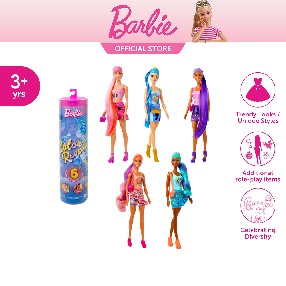 • เตรียมพบกับความเซอร์ไพรส์รุปแบบล่าสุดกว่า 6 อย่างใน 1 แพ็คเกจ ตุ๊กตาบาร์บี้คัลเลอร์รีวีลจะมามอบบความสุขทุกรูปแบบ! เด็ก ๆ จะสนุกไปกับการแสดงชุดเดนิมทั้งหมดด้วยนวัตกรรมการเผยสีตามแบบฉบับบาร์บี้!