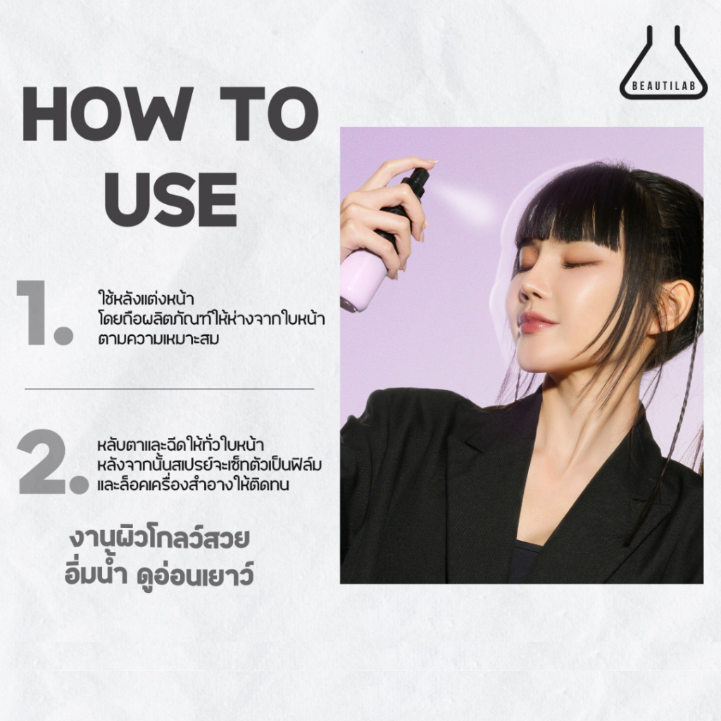 1. ใช้หลังแต่งหน้า โดยถือผลิตภัณฑ์ให้ห่างจากใบหน้าตามความเหมาะสม