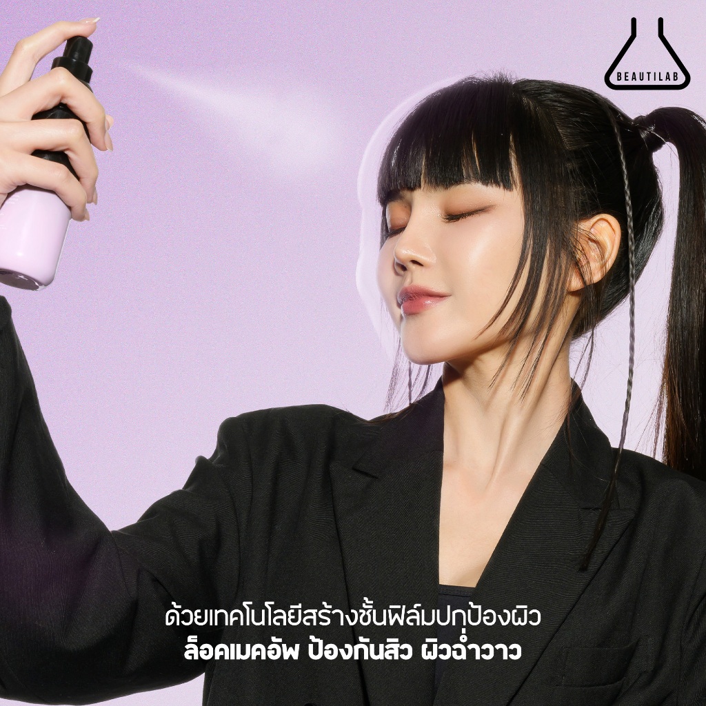 2. หลับตาและฉีดให้ทั่วใบหน้า สเปรย์จะเซ็ทตัวเป็นฟิล์มและล็อคเครื่องสำอางให้ติดทน
