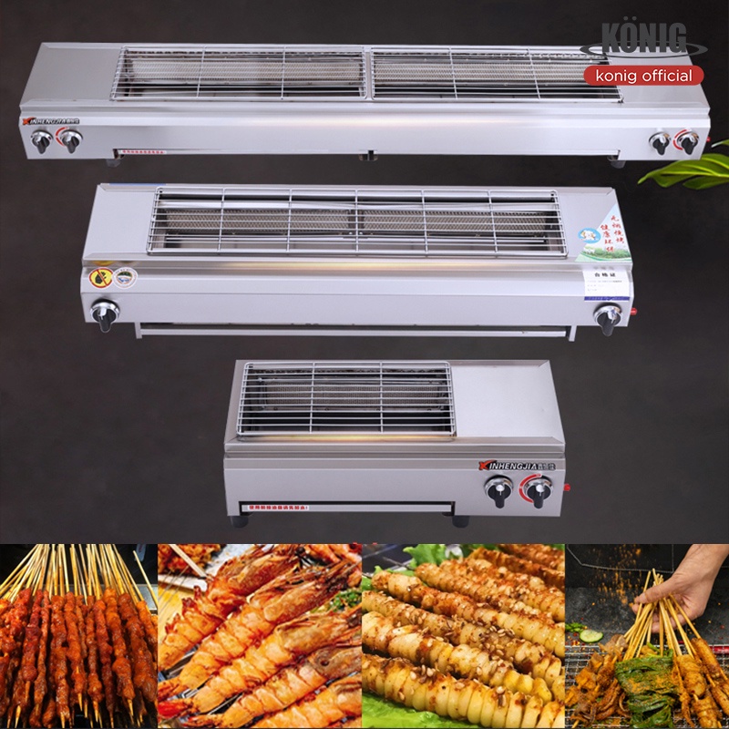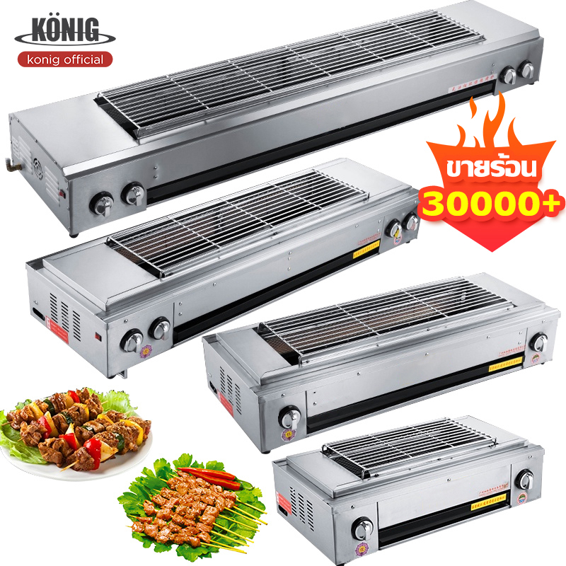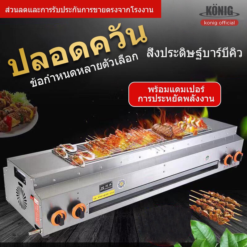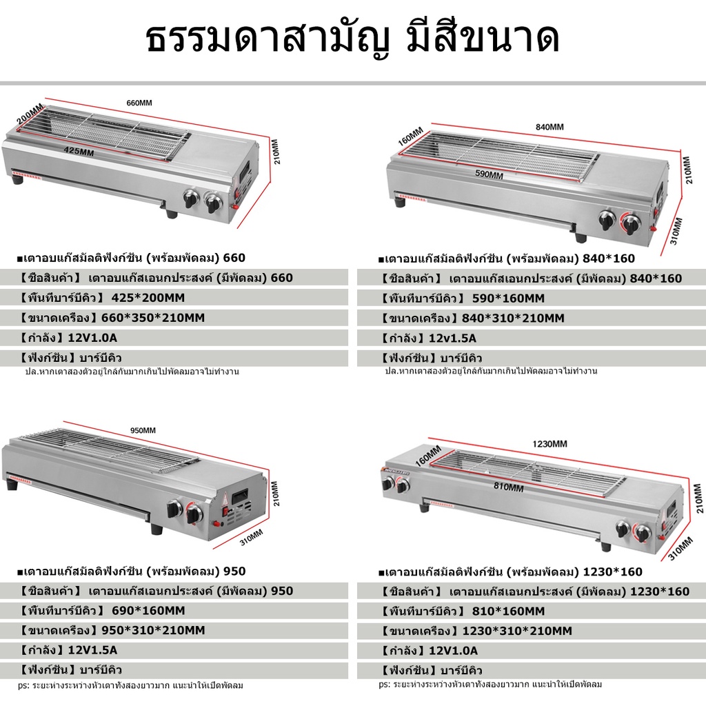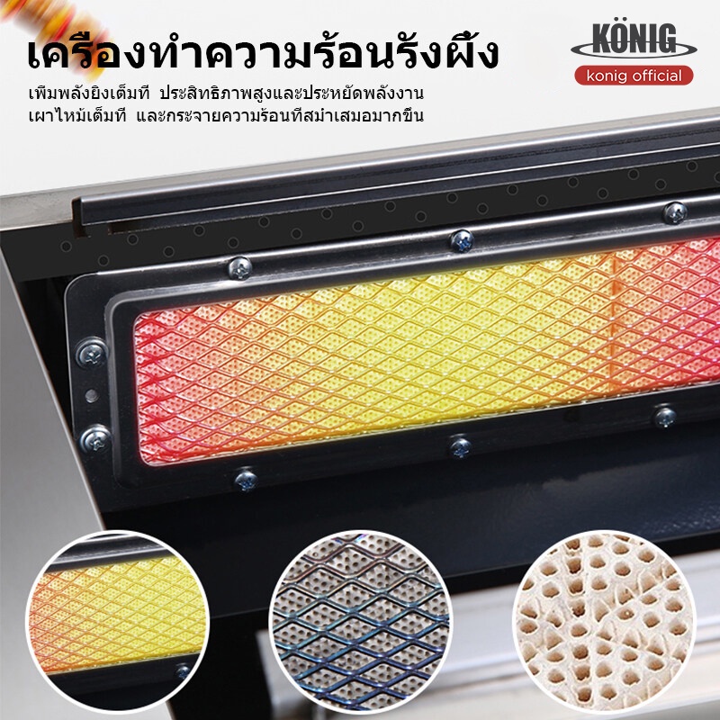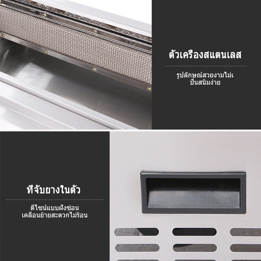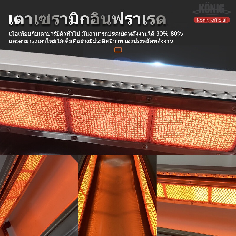 -เตาย่างไร้ควัน ไม่มีเปลวไฟช่วยลดควันมัน แผงนี้ถอดออกได้และไม่ต้องทำความสะอาด เตาจานเซรามิกอินฟราเรด พัดลมประหยัดพลังงาน การกระจายความร้อนได้ดี การจุดไฟระบบอิเล็กทรอนิกส์ ปรับความแรงไฟได้ ราย-ตัวเตาทำจากสแตนเลสทั้งตัว แข็งแรง ทนทาน หัวเตายาวทำจากสแตนเลส ใส่แผ่นอินฟาเรดอย่างดี หัวเตายาวจะฝังอยู่ด้านข้างของเตาทั้ง 2 ด้าน เมื่อปิ้งอาหาร เศษอาหาร น้ำ น้ำมัน หล่นลงจะไม่ทำให้เกิดควัน จึงเหมาะกับการปิ้งย่างอาหาร เช่น หมู่ปิ้ง ไส้กรอกอีสาน ของสดต่างๆ และอาหารซีฟู้ด เป็นต้น
