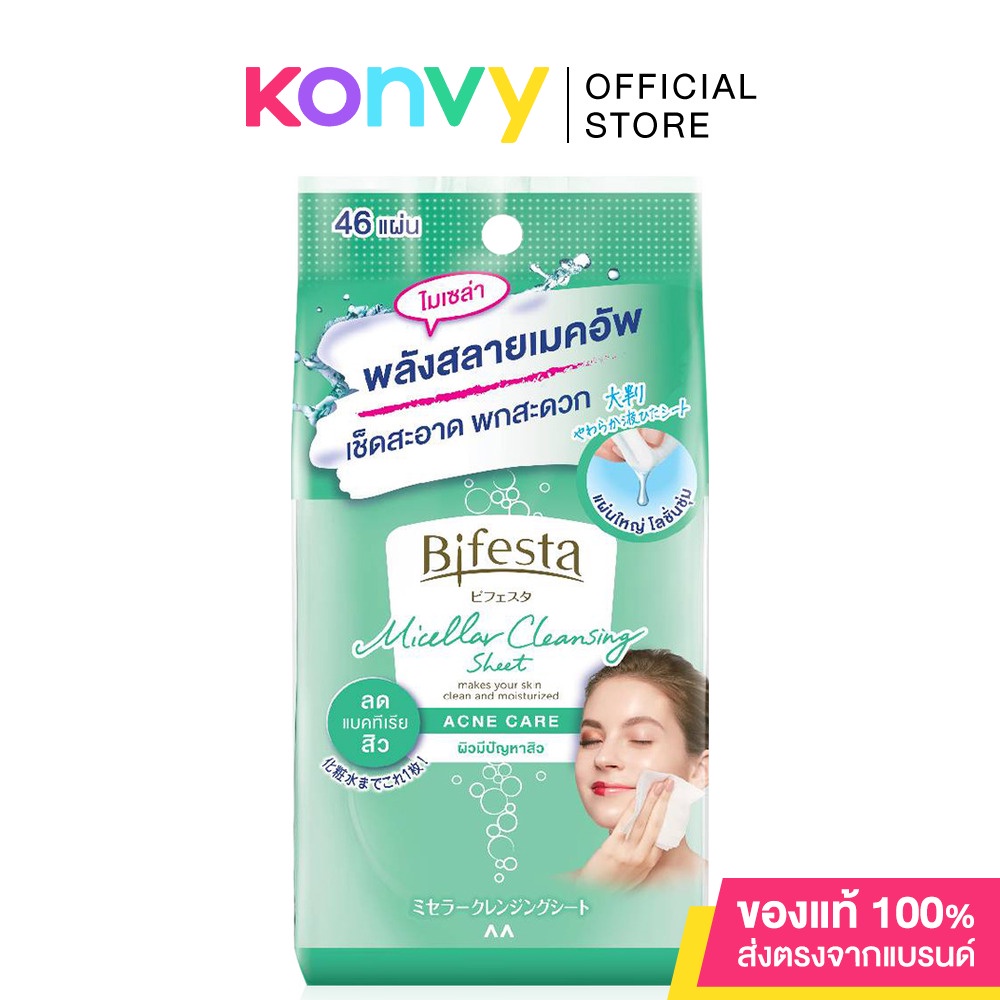 Cr. facebook.com/BifestaThailandBifesta Micellar Cleansing Sheet 46Sheetsแผ่นเช็ดเครื่องสำอางและทำความสะอาดผิว ด้วย 3 พลังไมเซล่า เข้าสลายเครื่องสำอาง สิ่งสกปรก เซลล์ผิวเก่า ได้สะอาดหมดจดโดยไม่ทิ้งคราบอุดตันผิว อ่อนโยน ด้วยสูตรลดการเสียดสี (Low friction formula) พร้อมกับแผ่นคอตตอนหนานุ่ม ชุ่มฉ่ำด้วยโลชั่น เช็ดง่าย ไม่ระคายผิว
