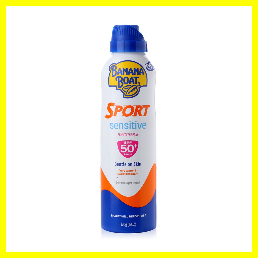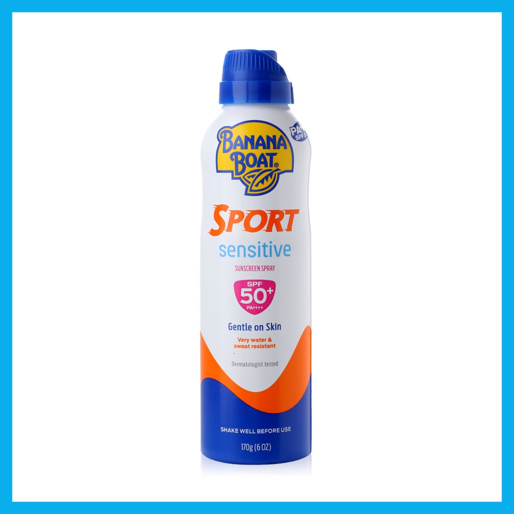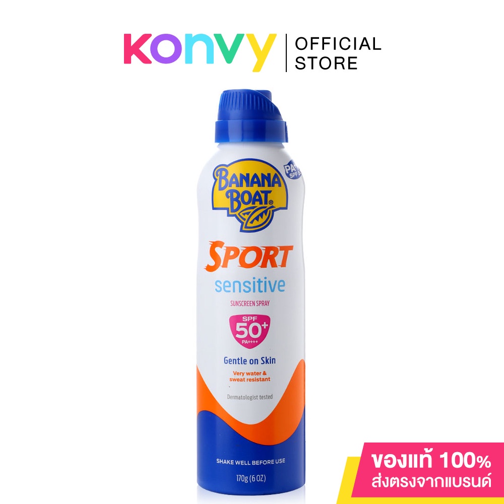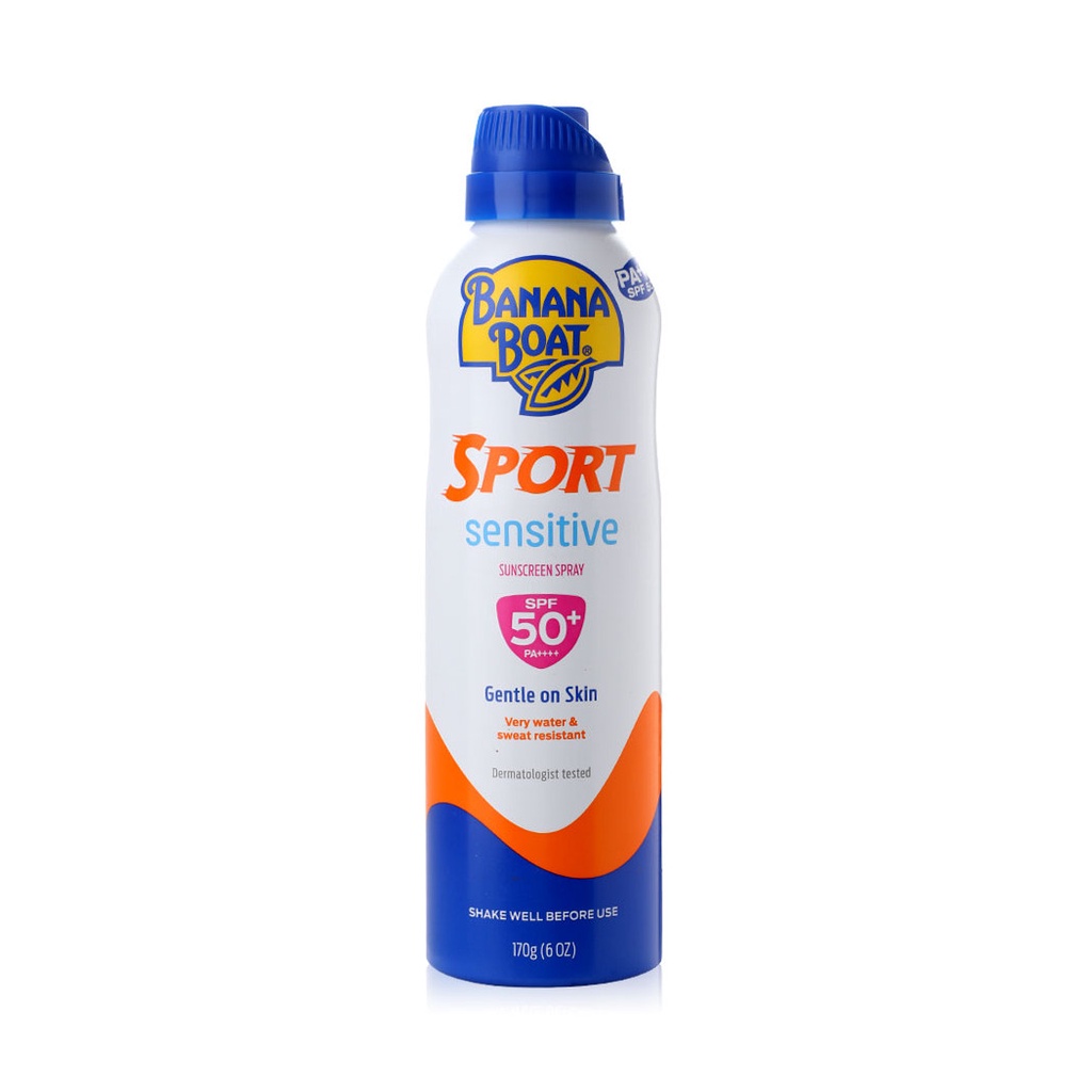 Banana Boat Sport Sensitive Sunscreen Spray SPF50+ Pa++++ 170gผลิตภัณฑ์สเปรย์กันแดด เนื้อสเปรย์บางเบา ไม่เหนียวเหนอะหนะ ช่วยป้องกันรังสี UVA/UVB กันน้ำ กันเหงื่อดีเยี่ยม เหมาะสำหรับกิจกรรมกีฬา ดำน้ำ ว่ายน้ำ วิ่ง เทนนิส อื่นๆ เเละกิจกกรมกลางเเจ้ง ไม่มีส่วนผสมของ Oxybenzone & Parabens ไม่มีน้ำมันและน้ำหอม ช่วยให้คุณได้สนุกกับครอบครัวทั้งว่ายน้ำและออกแดดกลางแจ้งได้อย่างไร้กังวล• ส่วนผสมสารเคมีลดลง 25%