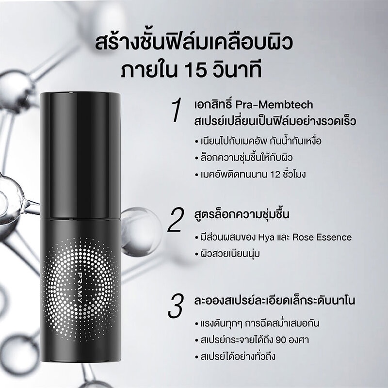 Pramy Moisturizing Makeup Setting Spray Dewy Finish 65mlเซ็ตติ้งสเปรย์ที่อ่อนโยน ฟินิชดิวอี้ สำหรับผิวแห้ง มอบฟิล์มปกป้องผิวของคุณ ล็อคเมคอัพให้สดใสได้นานถึง 12 ชั่วโมง คุณจึงไม่ต้องกังวลว่าเมคอัพจะละลายอีกต่อไป• การเคลือบทับเมคอัพ: ด้วยโคพอลิเมอร์ SYNTRAN® PC5778 & VP/VA ซึ่งยึดติดกับรองพื้นเพื่อสร้างการเคลือบที่บางและยืดหยุ่น ลดการสูญเสียความชุ่มชื้นและการละลายของเมคอัพให้น้อยที่สุด