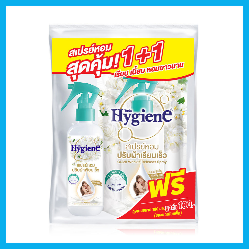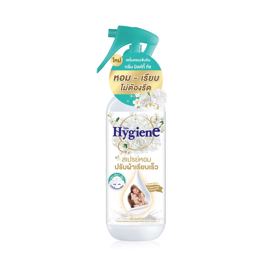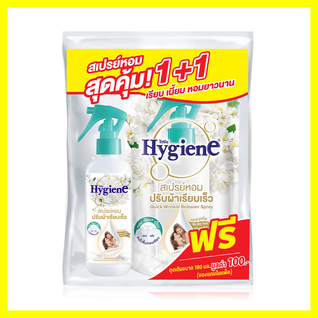 Hygiene Freshener Wrinkle Spray [220ml + Refill 180ml] #Milky Touchสเปรย์หอมปรับผ้าเรียบเร็ว กลิ่นมิลค์กี้ ทัช ช่วยลดรอยยับให้เสื้อผ้า โดยไม่ต้องรีดซ้ำ และดับกลิ่นเฟอร์นิเจอร์ผ้าต่างๆ และได้ทุกประเภทผ้า เพียงฉีด ลูบเสื้อผ้าจะเรียบขึ้นผ้าเรียบ เพียงฉีด และลูบเบาๆ