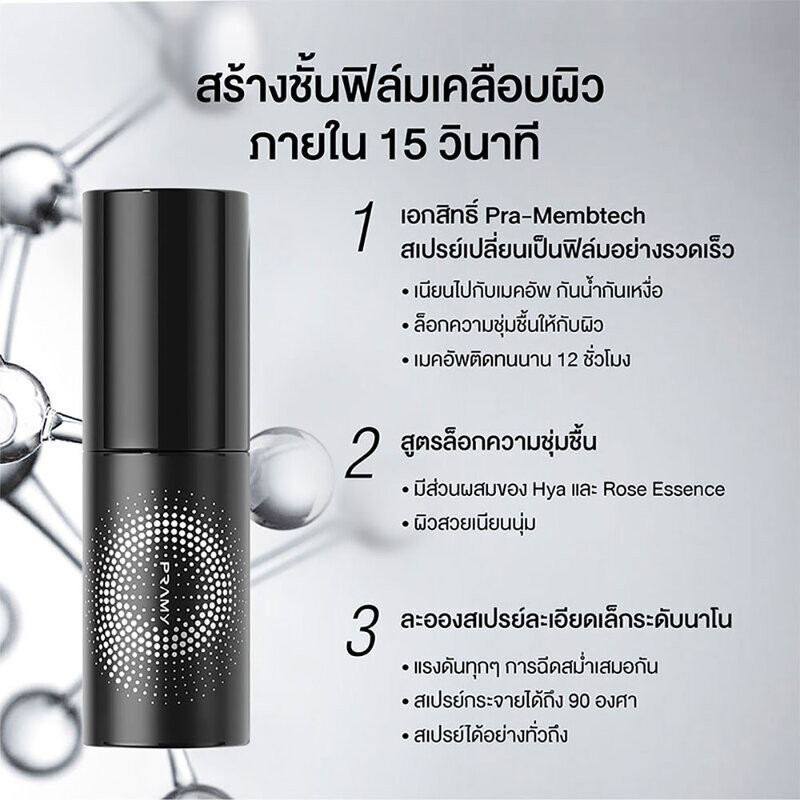 Pramy Moisturizing Makeup Setting Spray Matte Finish 100mlสเปรย์ล็อกเมคอัพสูตรอ่อนโยนพร้อมฟินิชแมตต์ สำหรับผิวผสมและผิวมัน นวัตกรรมใหม่จาก Pramy Lab เอกสิทธิ์ Pra-Membtech ละอองละเอียดเปลี่ยนเป็นชั้นฟิล์มเคลือบผิวอย่างรวดเร็ว ช่วยล็อกเครื่องสำอางให้ติดทนนานถึง 12 ชั่วโมง•ล็อกเมคอัพ ติดทนนาน 12 ชม.:สร้างชั้นฟิล์มเคลือบผิวอย่างรวดเร็ว ด้วยเอกสิทธิ์ Pra-Membtech สเปรย์เปลี่ยนเป็นฟิล์มอย่างรวดเร็ว ซึบไว ไม่อุดตันผิว และช่วยล็อกเมคอัพให้ติดทนนาน 12 ชั่วโมง