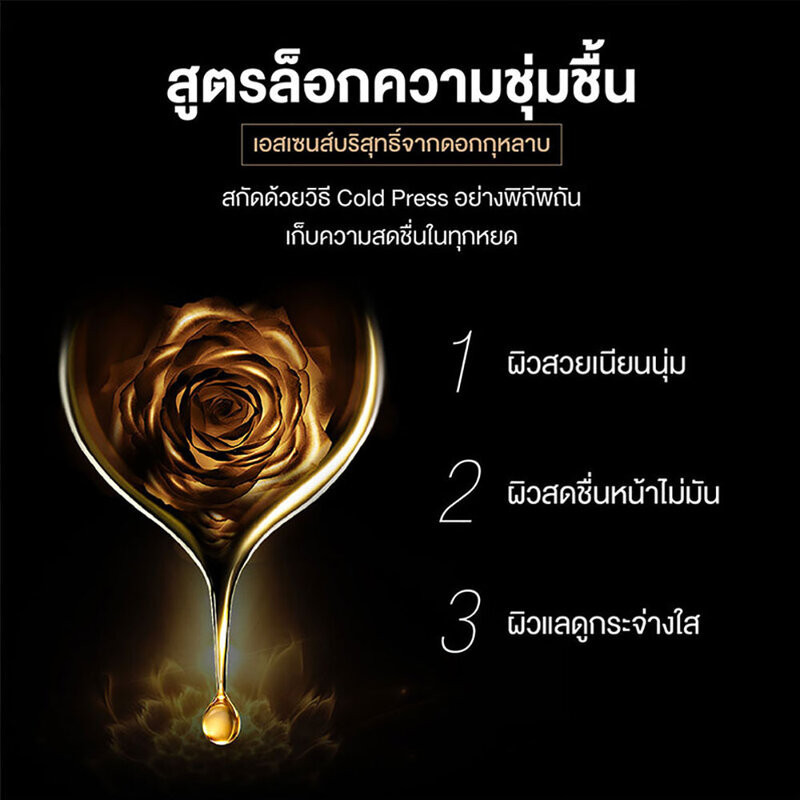 •สูตรล็อกความชุ่มชื้น:มีส่วนผสมของ Hya และ Rose Essence สกัดด้วยวิธี Cold Press อย่างพิถีพิถัน ช่วยให้ผิวดูสวยเนียนนุ่ม สดชื่น หน้าไม่มัน เผยผิวแลดูกระจ่างใส
