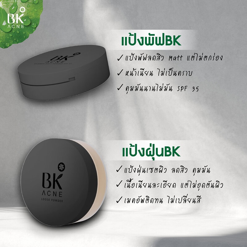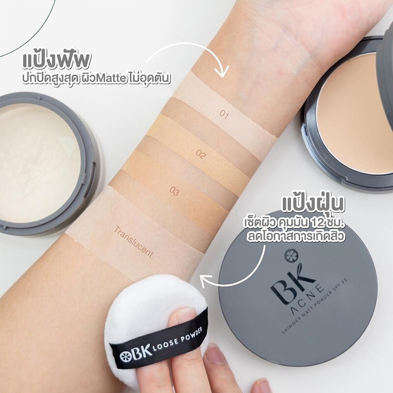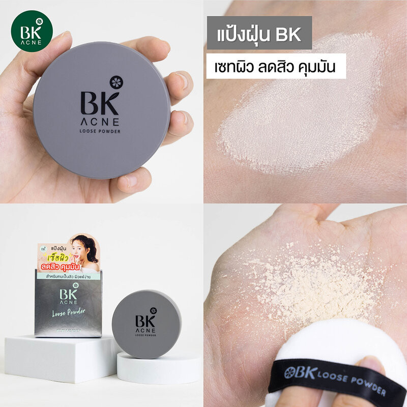 Cr.facebook.com/BKthailandofficialBK Acne Loose Powder แป้งฝุ่นควบคุมความมันตลอดวัน บางเบาไม่อุดตันผิว เนื้อละเอียดโปร่งแสง สัมผัสเนียนนุ่มดุจกำมะหยี่ สามารถใช้ได้ทุกสีผิว ไม่ทำให้สีรองพื้นเพี้ยน เผยผิวเรียบเนียนอย่างเป็นธรรมชาติ ผ่านการทดสอบจากสถาบันผู้เชียวชาญด้านผิวพรรณจากยุโรป ไม่ก่อให้เกิดการระคายเคือง
