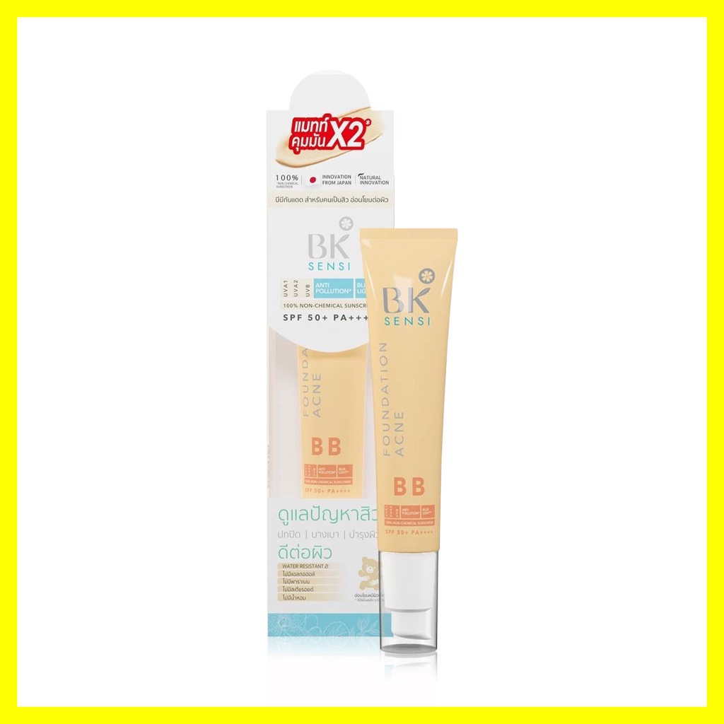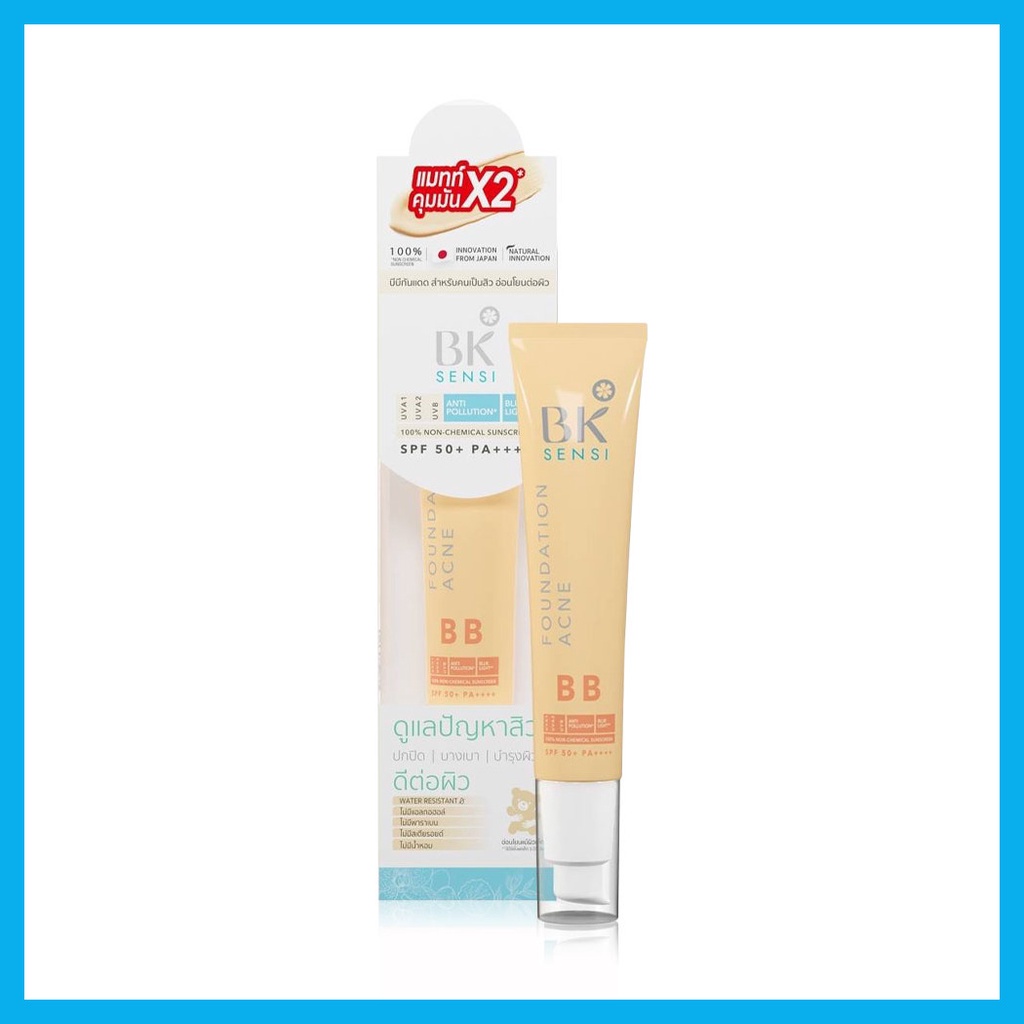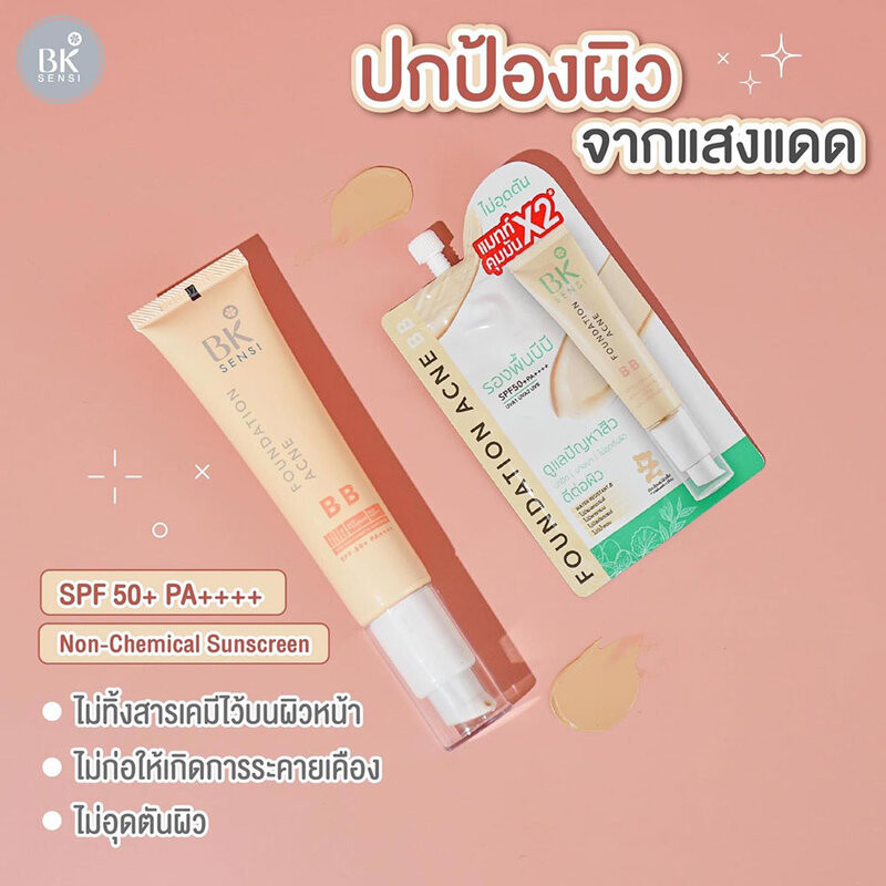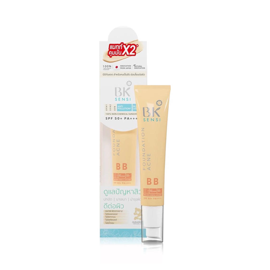 Cr.facebook.com/Bkmask123BK Sensi Foundation Acne BB SPF50+/PA++++ 35gบีบีครีมเนื้อบางเบา เกลี่ยง่าย ไม่เป็นคราบ ไม่อุดตัน ช่วยปกปิดผิวให้ดูเรียบเนียน เปล่งปลั่ง ควมบคุมความมัน พร้อมปกป้องผิวจากรังสี UVA และ UVB ด้วยค่า SPF50+/PA++++ รวมถึงรังสี IR จากจอคอมพิวเตอร์อีกด้วย