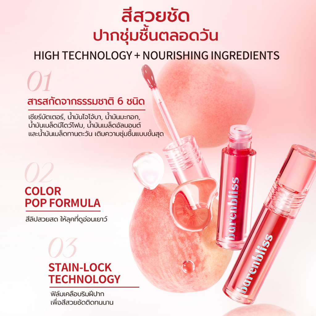 bnb barenbliss Peach Makes Perfect Lip Tint ลิปทินปากฉ่ำ ริมฝีปากชุ่มชื่น ติดทนนาน 12ชมลิปทินต์กลิ่นพีชที่ช่วยครีเอตลุคปากฉ่ำวาวด้วยส่วนผสมธรรมชาติ 6 ชนิดและเนื้อเจลซอฟต์หวาน