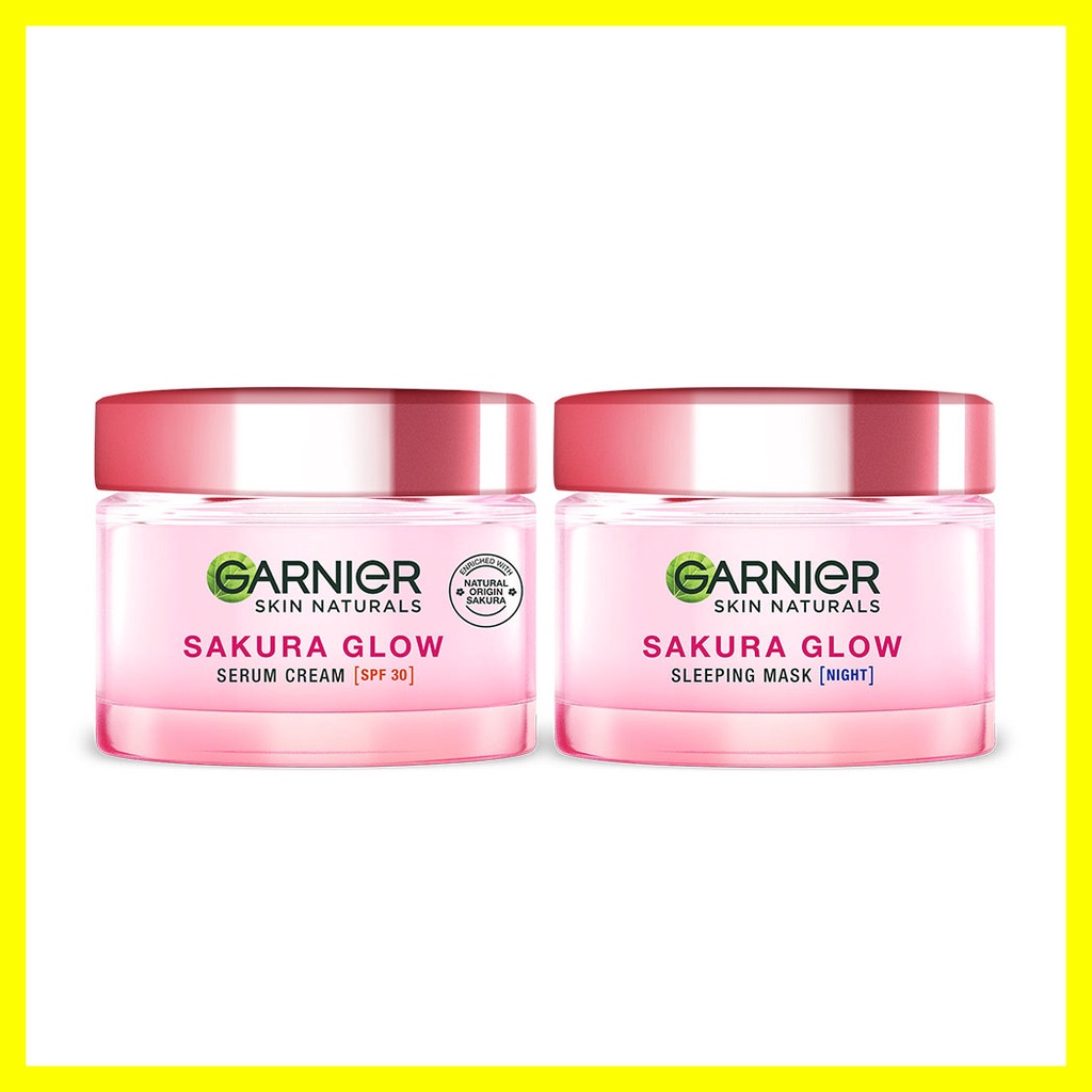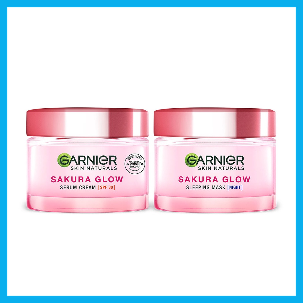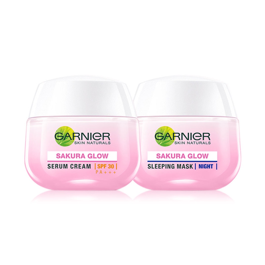 Garnier Sakura White Set2 Items[ Day Cream SPF30/PA+++ 50ml + Night Cream 50ml] เซทผลิตภัณฑ์บำรุงผิวหน้า สูตรกลางวันและกลางคืน อุดมด้วยสารสกัดซากุระเข้มข้น ตรงเข้าบำรุงผิวอย่างล้ำลึก ปรับให้ผิวดูกระจ่างใสขึ้น ลดเลือนจุดด่างดำ เพื่อผิวเรียบเนียนขึ้น ใช้ได้แม้กับผิวที่แพ้ง่ายในเซทประกอบด้วย