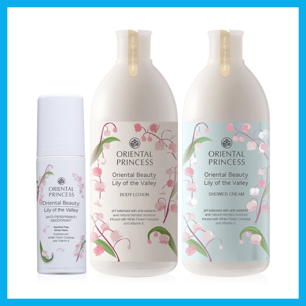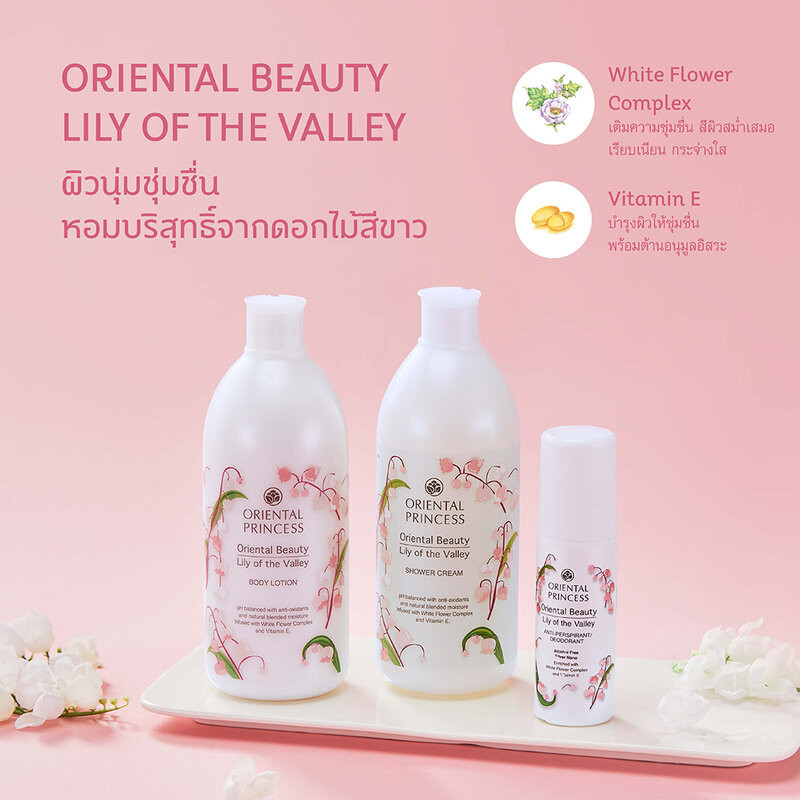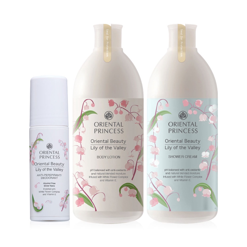 Oriental Princess Beauty Lily Of The Valley Set 3 Items เซทผลิตภัณฑ์อาบน้ำดูแลผิวกาย ด้วยคุณสมบัติเฉพาะ pH Balanced คืนสมดุลสู่ผิวสวยด้วยสารสกัดพิเศษจากธรรมชาติที่เป็นเสมือนเกราะคุ้มกันผิว ช่วยกักเก็บน้ำไว้กับผิวอย่างยาวนานยิ่งขึ้น มอบกลิ่นหอมฟุ้ง บริสุทธิ์สะอาดอ่อนโยนจากดอกไม้สีขาว ผสานคุณค่าบำรุงจากธรรมชาติด้วยสารสกัดของ White Flower Complex และ Vitamin E บำรุงผิวให้เนียนนุ่มชุ่มชื้นหลังการอาบน้ำ พร้อมปกป้องผิวจากอนุมูลอิสระ เผยผิวนวลนุ่ม สดใสเปล่งปลั่งอย่างเป็นธรรมชาติในเซทประกอบด้วย