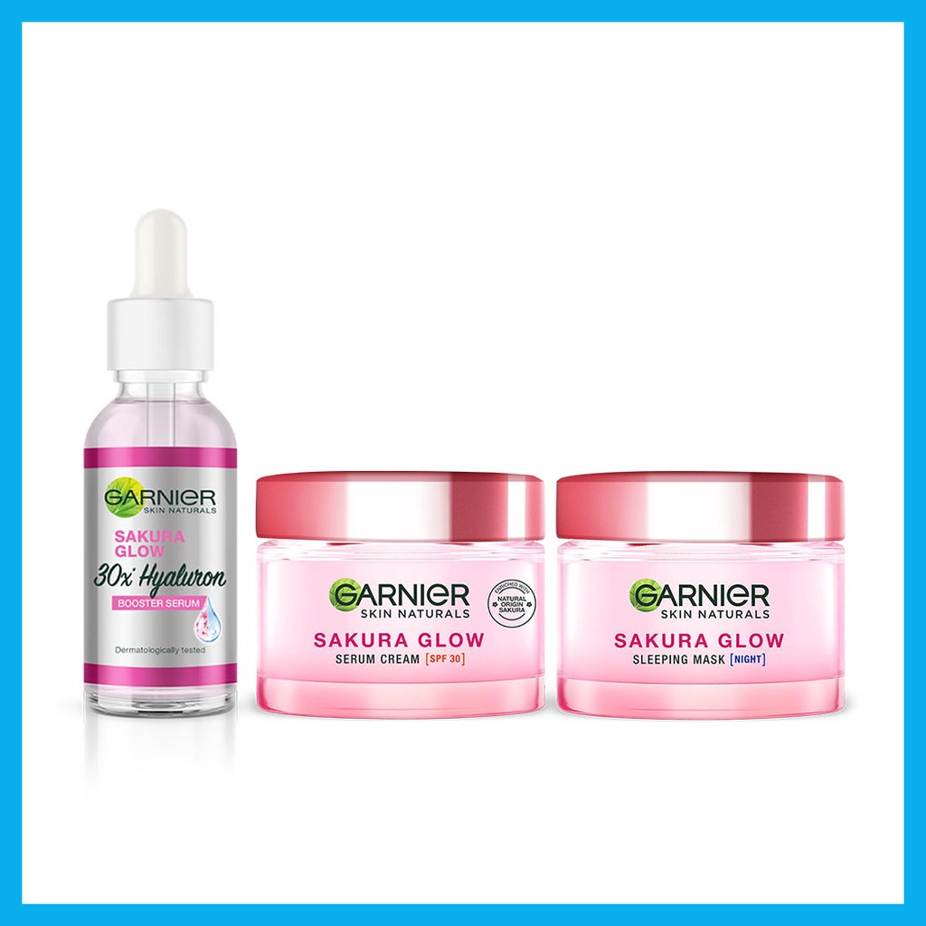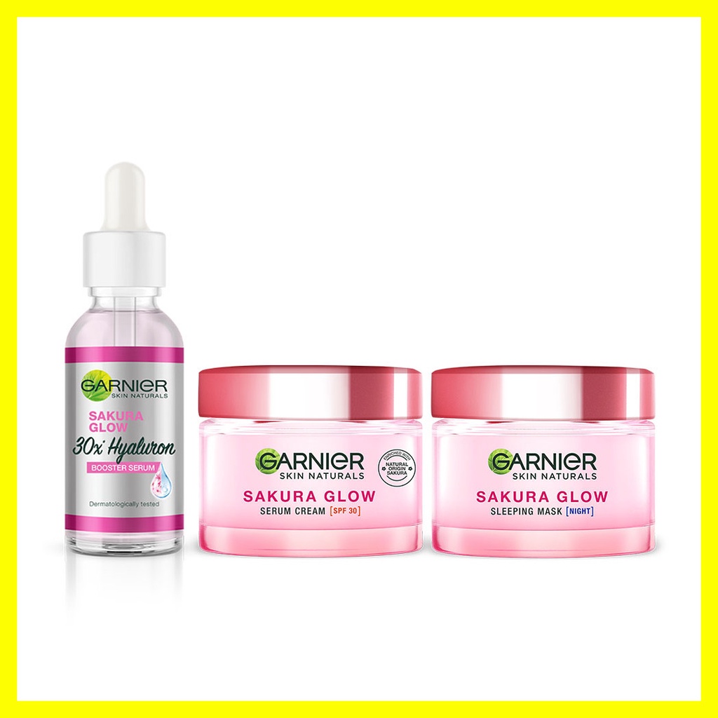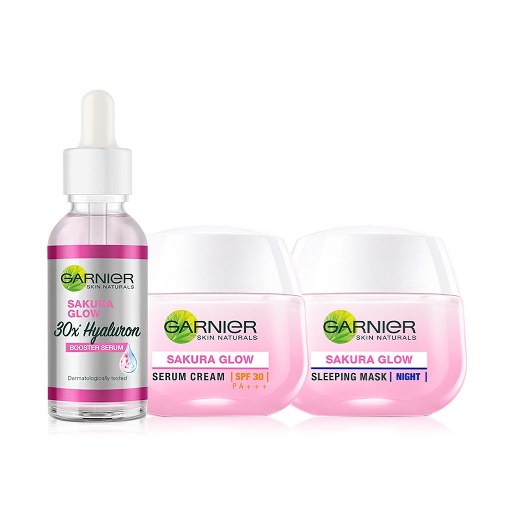Garnier Sakura White Set3 Items[Hyaluron Booster Serum 30ml + Day 50ml + Night Cream 50ml] เซทผลิตภัณฑ์ดูแลผิวหน้า อุดมสารสกัดซากุระเข้มข้น ช่วยให้ผิวกระจ่างใส ดูอมชมพู นุ่มเด้ง ดูฉ่ำน้ำในหนึ่งเดียว เหมาะสำหรับผิวแพ้ง่ายในเซทประกอบด้วย