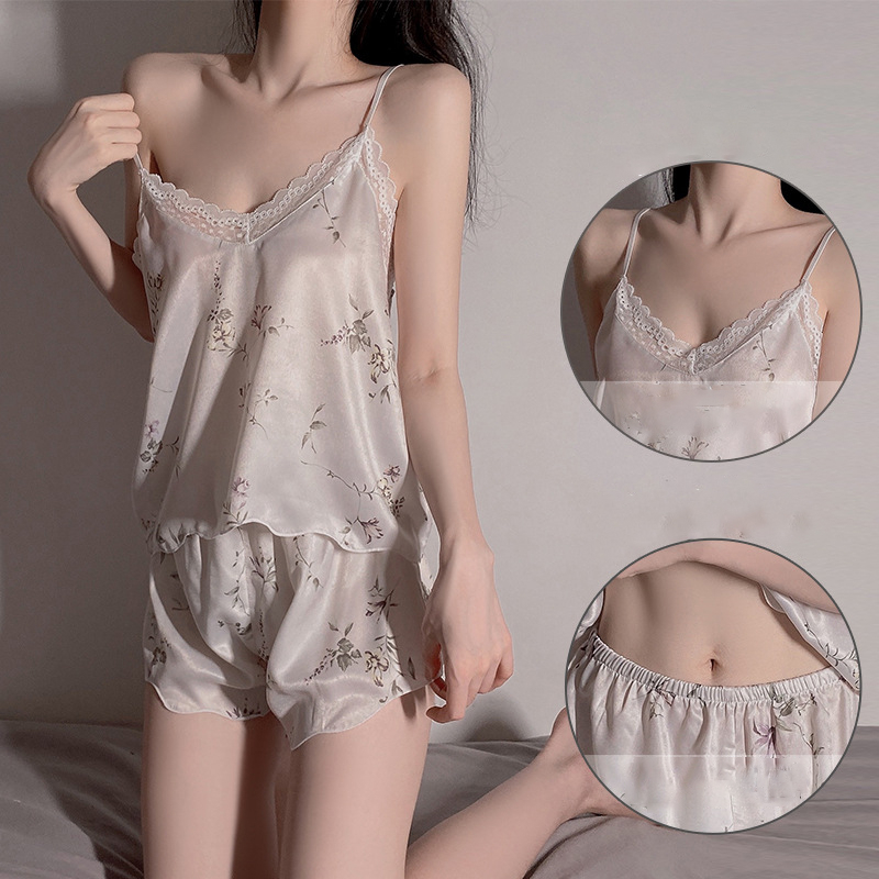 👍Quần đùi nữ tay ngắn cổ chữ V Lụa băng mới quần áo mặc nhà nữ ngoại cỡ đồ ngủ mới cho nữ [namai 128]