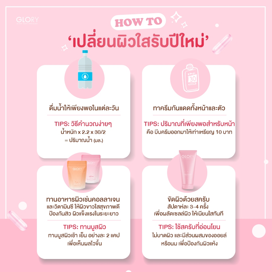 คำเตือน : เพื่อผลลัพธ์ที่ดีขึ้นควรดื่มน้ำ 2-3 ลิตรต่อวัน และรับประทานอาหารให้ครบ 5 หมู่เป็นประจำ