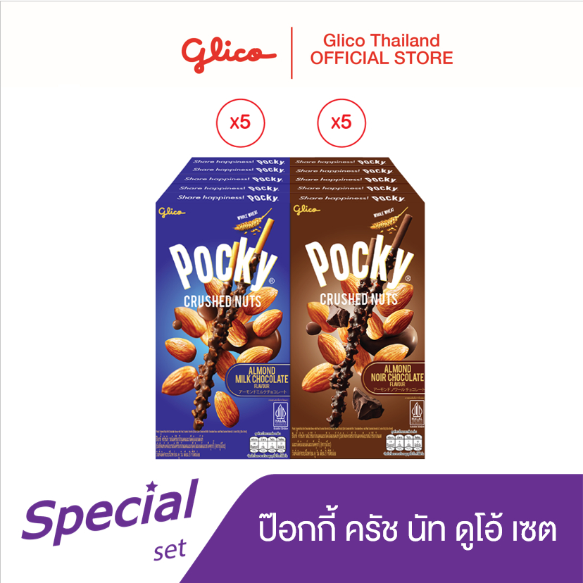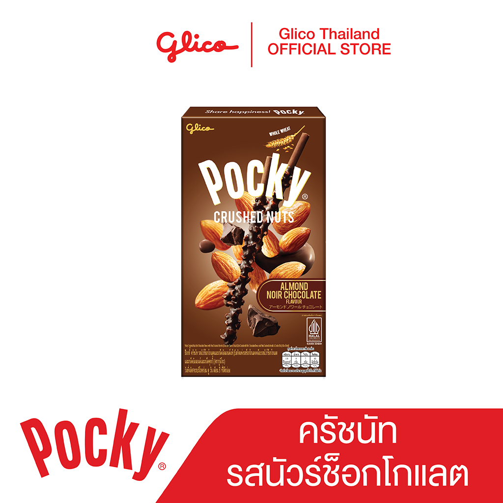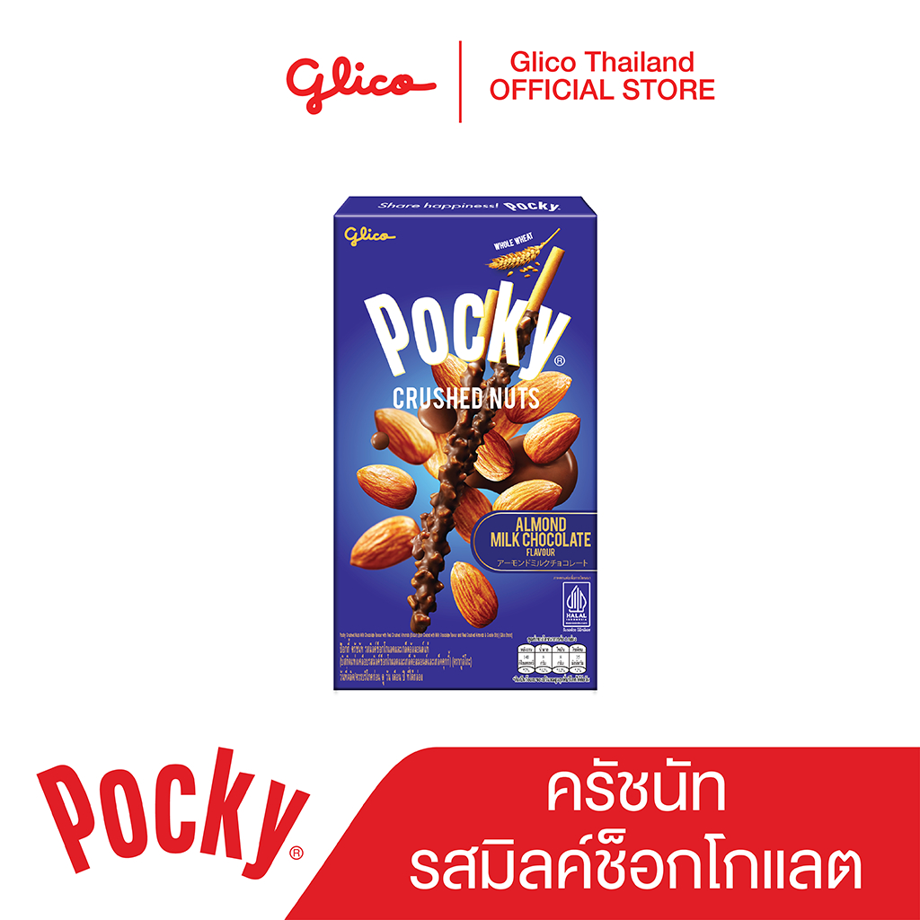 "ป๊อกกี้ ครัชนัท รสมิลค์ช็อกโกแลตและเกล็ดอัลมอนด์แท้บิสกิตแท่งโฮลวีต เคลือบครีมช็อกโกแลตแบบดับเบิ้ลดิปผสมกับถั่วอัลมอนด์ชิ้นโต มอบความกรุบกรอบขึ้นอีกระดับ"
