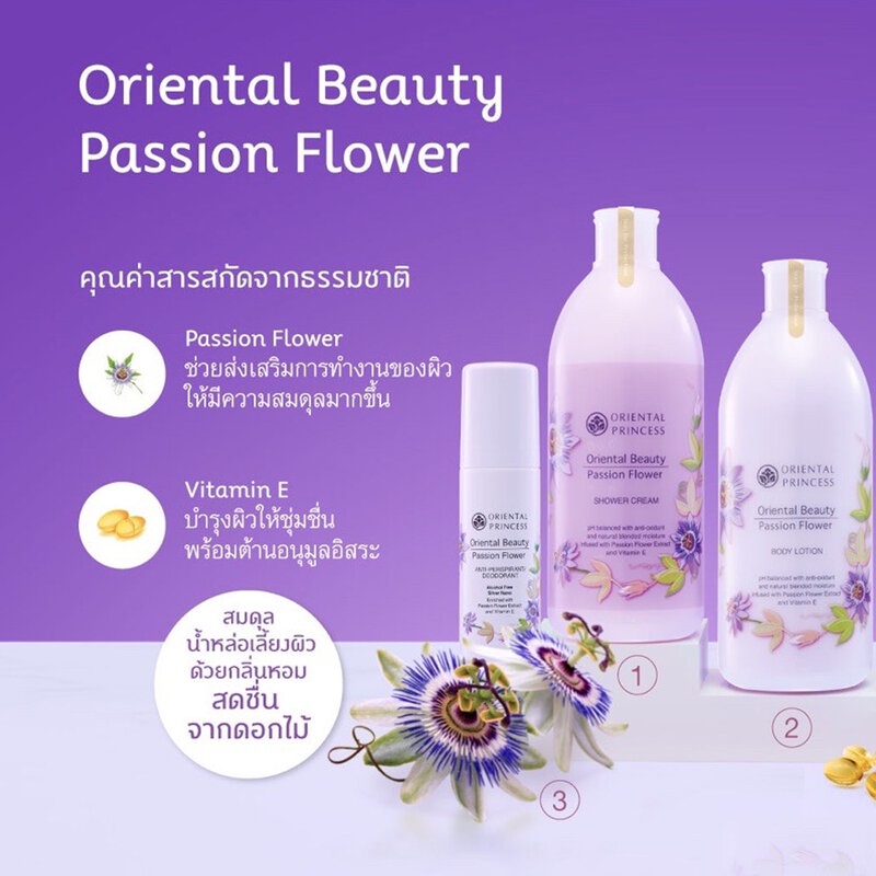 Oriental Princess Beauty Passion Flower Set 3 Items [Shower Cream 400ml + Body Lotion 400ml + Anti-Perspirant Deodorant 70ml]เซตผลิตภัณฑ์ทำความสะอาด และดูแลผิว 3 ชิ้น มอบกลิ่นหอมบริสุทธิ์ เติมความสดชื่นจากดอกไม้สด ให้ผิวนุ่มชุ่มชื้น ด้วย pH-Balance พร้อมคุณค่าธรรมชาติในเซตประกอบด้วย