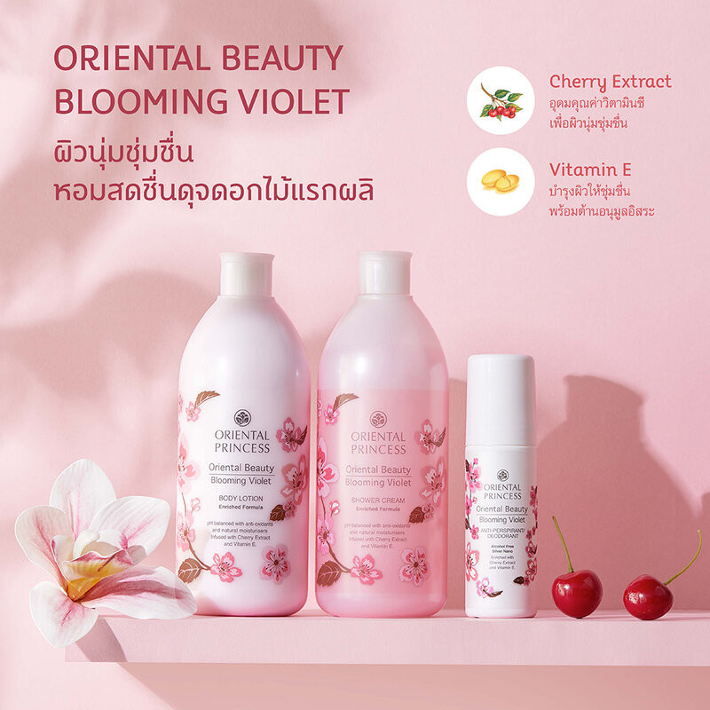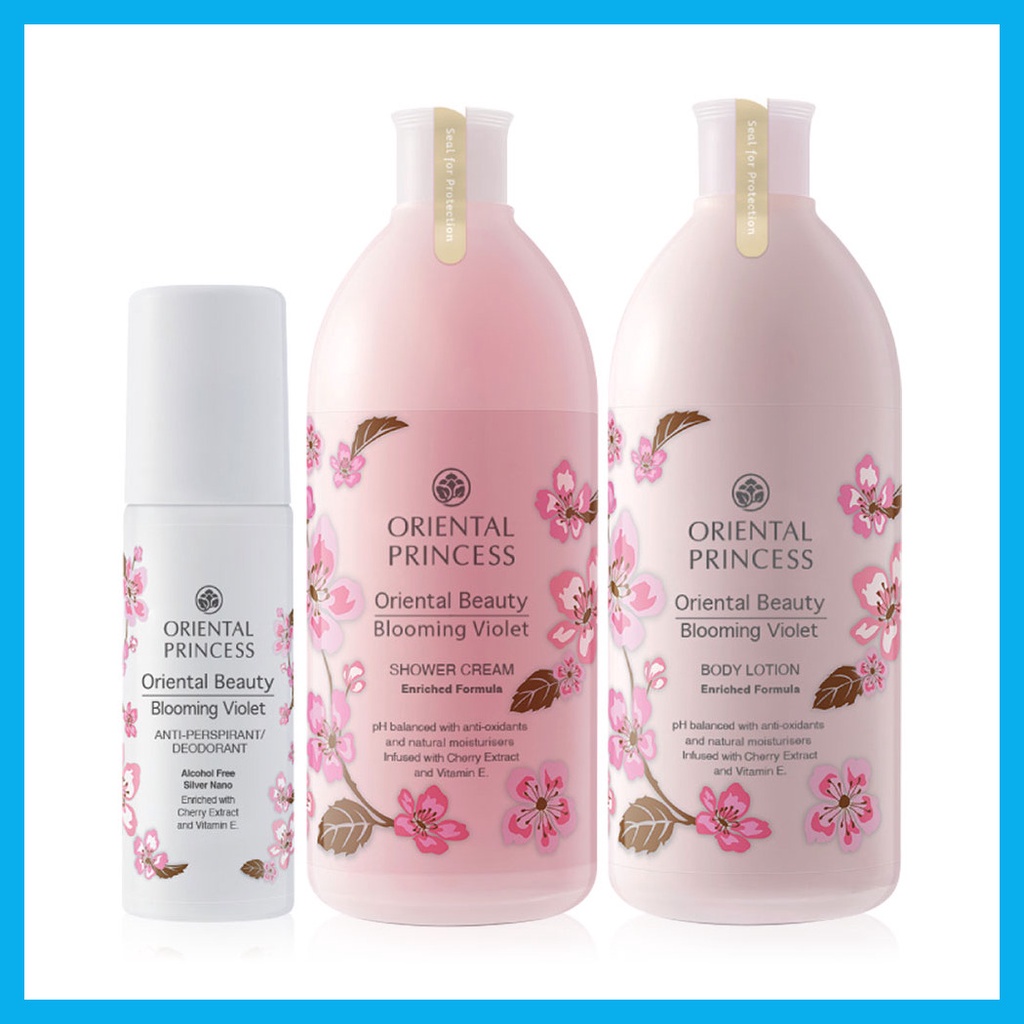 Oriental Princess Beauty Blooming Violet Set 3 Items (Shower Cream 400ml + Body Lotion 400ml + Deodorant 70ml) เซตผลิตภัณฑ์ทำความสะอาด และดูแลผิว 3 ชิ้น มอบกลิ่นหอมสดชื่น ดุจดอกไม้ผลิบาน ให้ผิวนุ่มชุ่มชื้น ด้วย pH-Balance พร้อมคุณค่าธรรมชาติในเซตประกอบด้วย