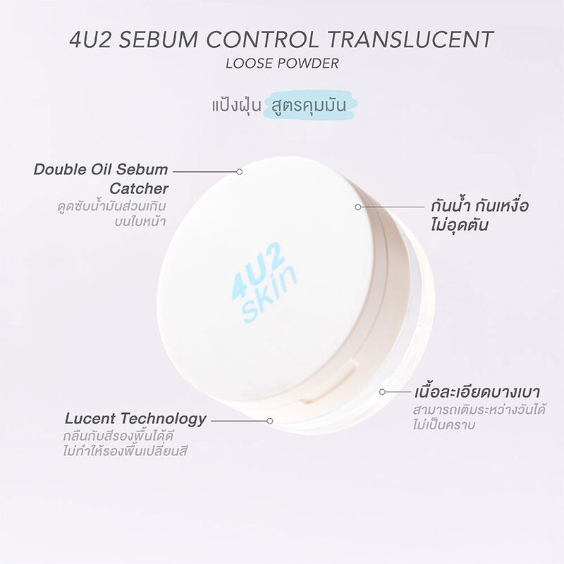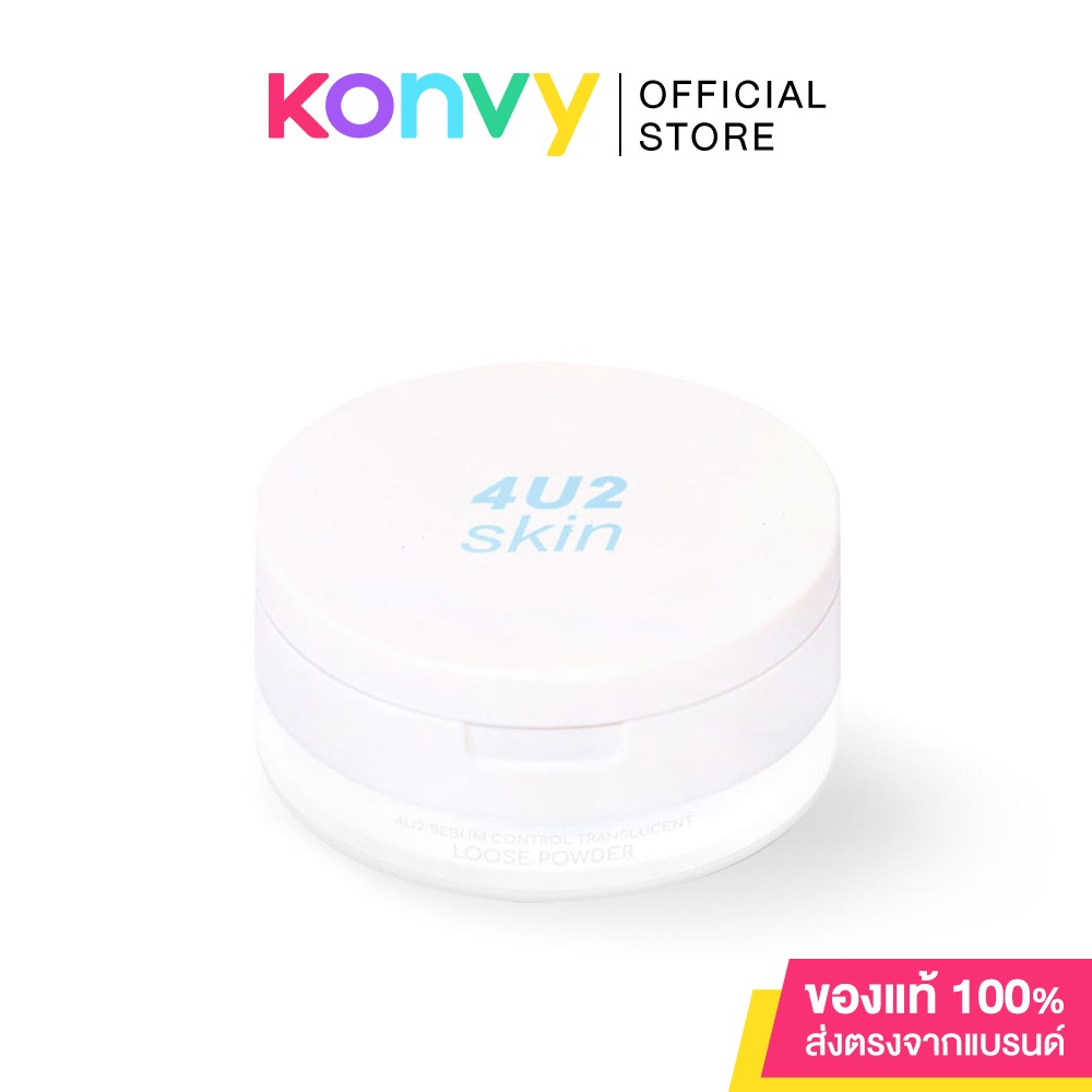 4U2 Skin Sebum Control Translucent Loose Powder 10gแป้งฝุ่นโปร่งแสง เนื้อเนียนละเอียดบางเบา มอบสัมผัสเบาสบาย ช่วยปรับผิวให้เรียบเนียนอย่างเป็นธรรมชาติ ด้วยสูตร Lucent Technology ที่ช่วยเพิ่มความนวลเนียนให้ผิวแลดูกระจ่างใส กลมกลืนกับสีรองพื้นได้ดี สามารถใช้ได้กับทุกสีผิว ทั้งยังผสานส่วนผสมของ Double Oil Sebum Catcher ซึ่งมีคุณสมบัติการคุมมัน จึงช่วยดูดซับน้ำมันส่วนเกินบนใบหน้า (Sebum) ได้อย่างมีประสิทธิภาพ และสามารถเติมความเนียนเรียบระหว่างวันได้•แป้งฝุ่นโปร่งแสงเนื้อละเอียด