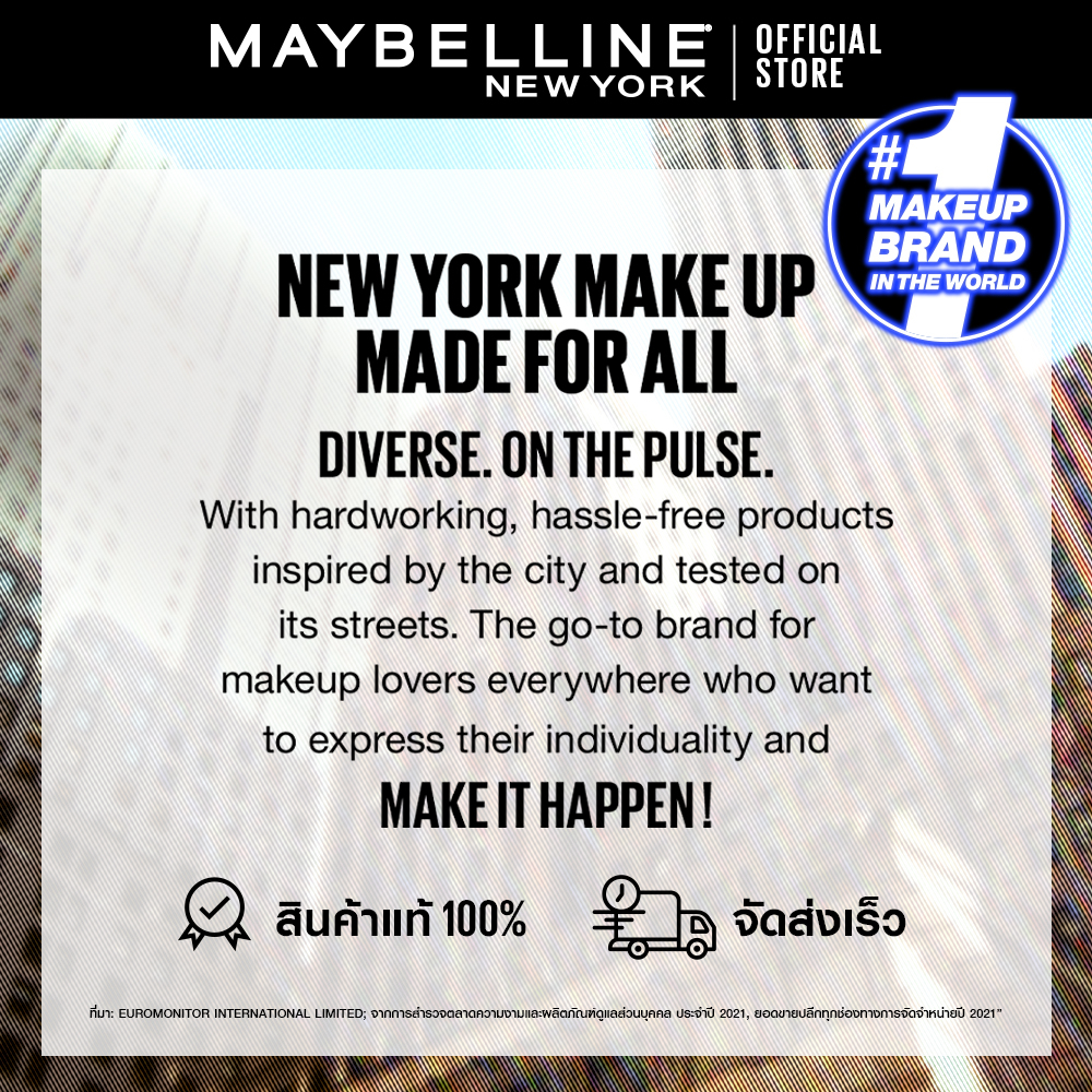 • แบรนด์ของเรา / ABOUT OUR BRANDเมย์เบลลีนนิวยอร์กเป็นแบรนด์เครื่องสำอางอันดับหนึ่งของโลกมีวางจำหน่ายในกว่า 120 ประเทศทั่วโลก ด้วยการผสมผสานสูตรที่ล้ำหน้าทางเทคโนโลยีกับความเชี่ยวชาญตามเทรนด์ จากมหานครนิวยอร์ก พันธกิจของ Maybelline New York ก็คือการนำเสนอ เครื่องสำอางนวัตกรรมใหม่ ที่เข้าถึงได้สำหรับผู้หญิงทุกคนMaybelline New York is the number one cosmetic brand in the world, available in over 120 countries. By combining technologically advanced formulations with on-trend expertise and New York City edge, Maybelline New York’s mission is to offer innovative, accessible and effortless cosmetics for every woman.