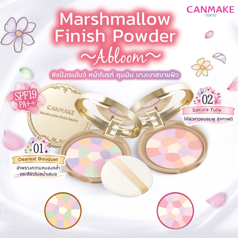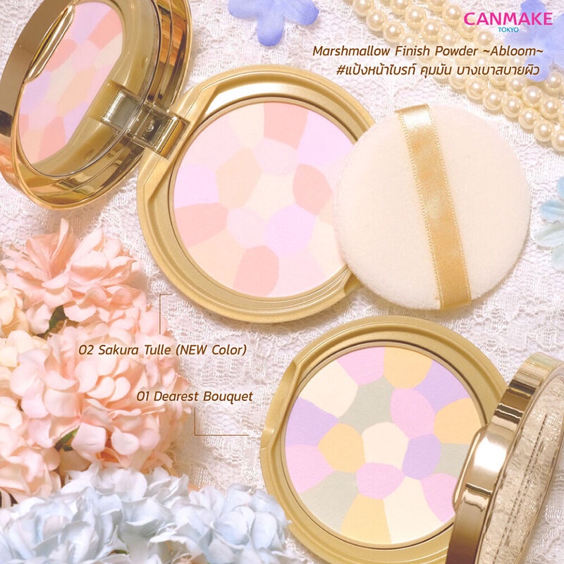 Cr. facebook.com/canmakethailandCanmake Marshmallow Finish Powder Abloom 4g #01 Dearest Bouquetแป้งโปรงแสงเนื้อละเอียดเนียนนุ่ม ดุจมาร์ชแมลโล่ ช่วยดูดซับความมัน สร้างเอกเฟกผิวสวยกระจ่างใสเป็นธรรมชาติด้วยเนื้อแป้ง 5 เฉดสี