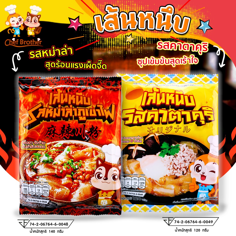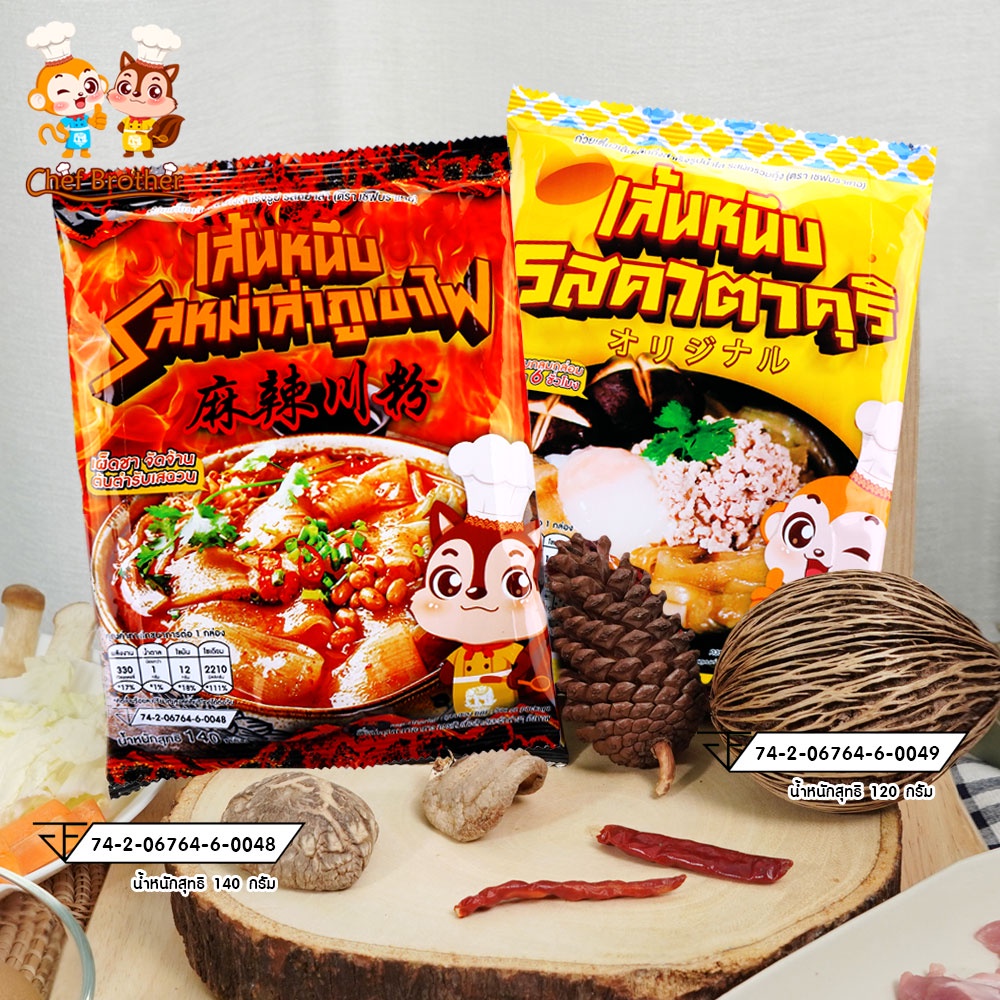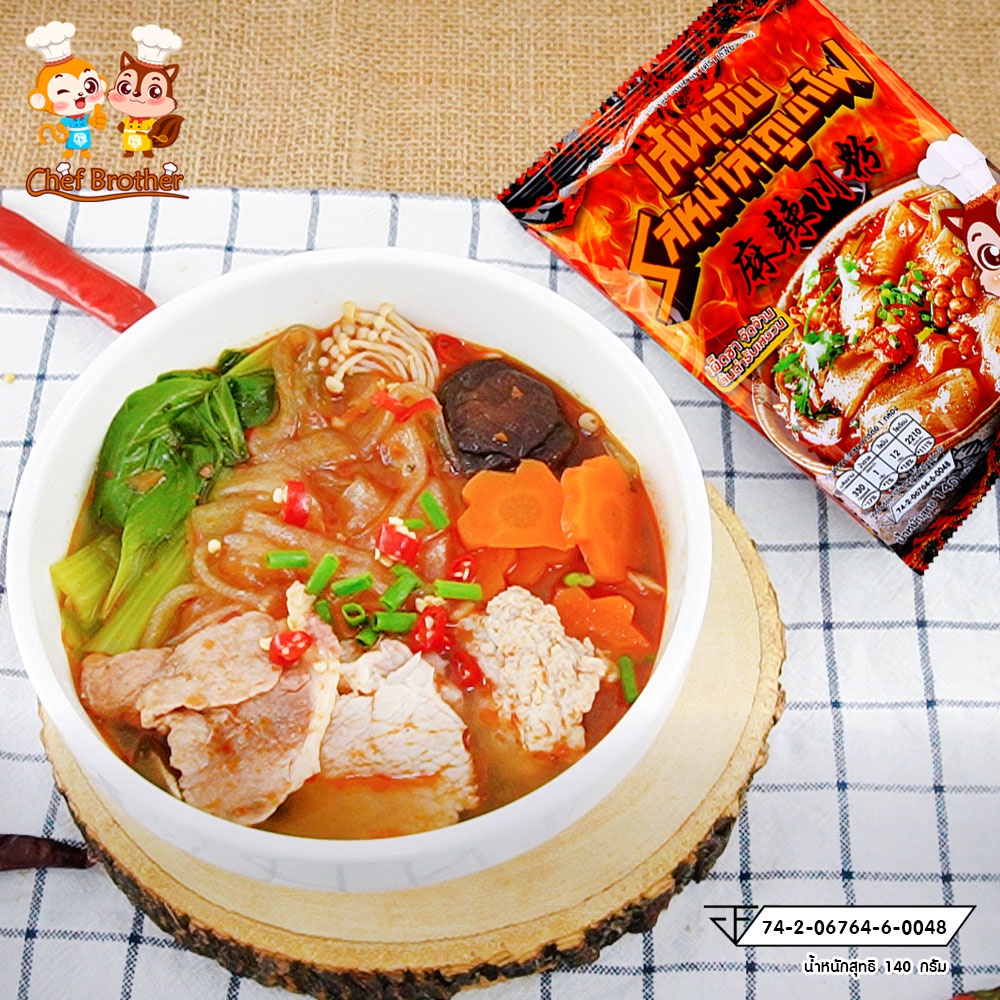 Chef Brother เส้นหนึบรสหม่าล่า(เส้นมันสำปะหลัง) เผ็ดชา จัดจ้าน ต้นตำรับเสฉวน วัตถุดิบนำเข้า จากมณฑลเสฉวนแท้ เพื่อรสชาติต้นตำรับหม่าล่าสุดร้อนแรง คลุงเคล้าด้วยเครื่องปรุง สุดพิเศษ