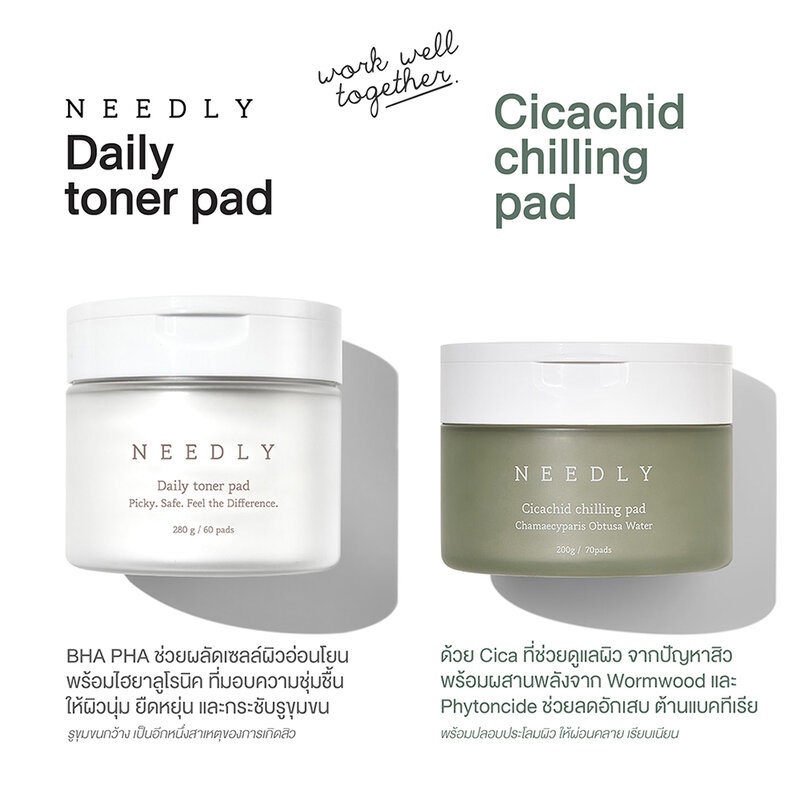 NEEDLY Cicachid Chilling Pad 70 Pads จัดการปัญหาผิวได้ตรงจุด ด้วยแผ่นเช็ดทำความสะอาดผิว อุดมด้วยสารสกัดจาก Cica, Wormwood และ Phytoncide ช่วยเพิ่มความสดชื่นและชุ่มชื้นให้ผิว ผ่อนคลายผิวจากความร้อนและมลภาวะ พร้อมดูแลผิวจากปัญหาสิว ลดอักเสบ ต้านแบคทีเรีย• อุดมด้วยสารสกัดจาก Cica, Wormwood และ Phytoncide