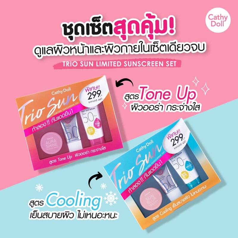Cr: Facebook.com/cathydollclubCathy Doll All Trio Sun Limited Sunscreen Set - Tone Up #Aqua Sun Whitening 3pcs ท้าลอง! กันแดดยืนหนึ่ง เซทผลิตภัณฑ์ สูตร Tone Up ผิวออร่ากระจ่างใส