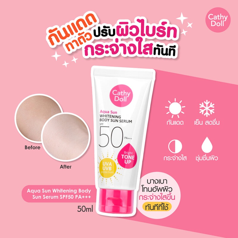 • Cathy Doll Aqua Sun Whitening Body Sun Serum SPF50/PA+++ 50ml ปกป้องผิว SPF50 PA+++ ลดการระคายเคืองของผิว